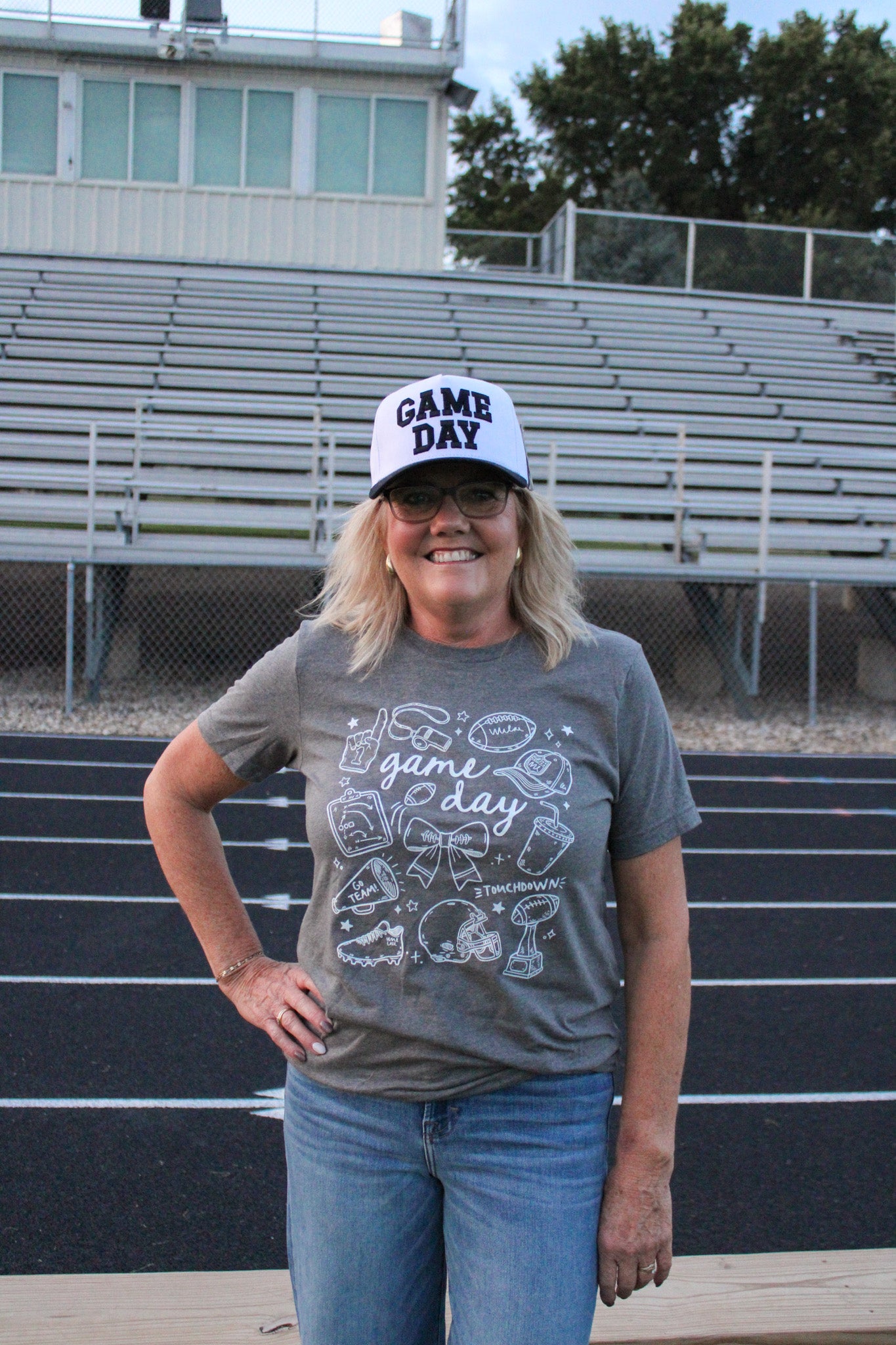 Show your team spirit in style with our Game Day Graphic Tee! This heather gray unisex tee features a fun, hand-drawn design with all your favorite game day essentials—helmets, cleats, foam fingers, and more—centered around a bold “game day” script.