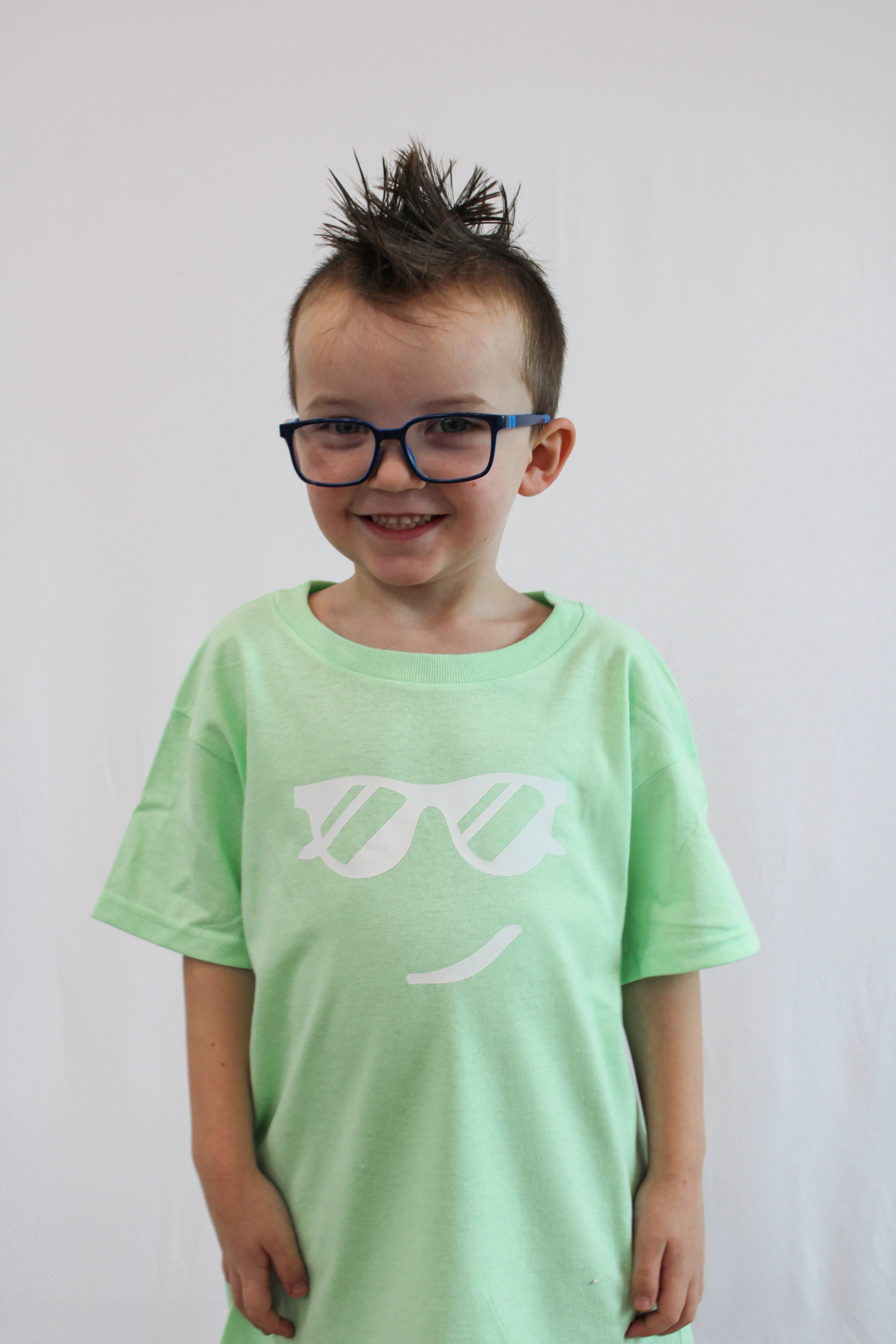 A fun, smiley sunglasses face imprinted on a toddler Bella+Canvas crewneck t-shirt.