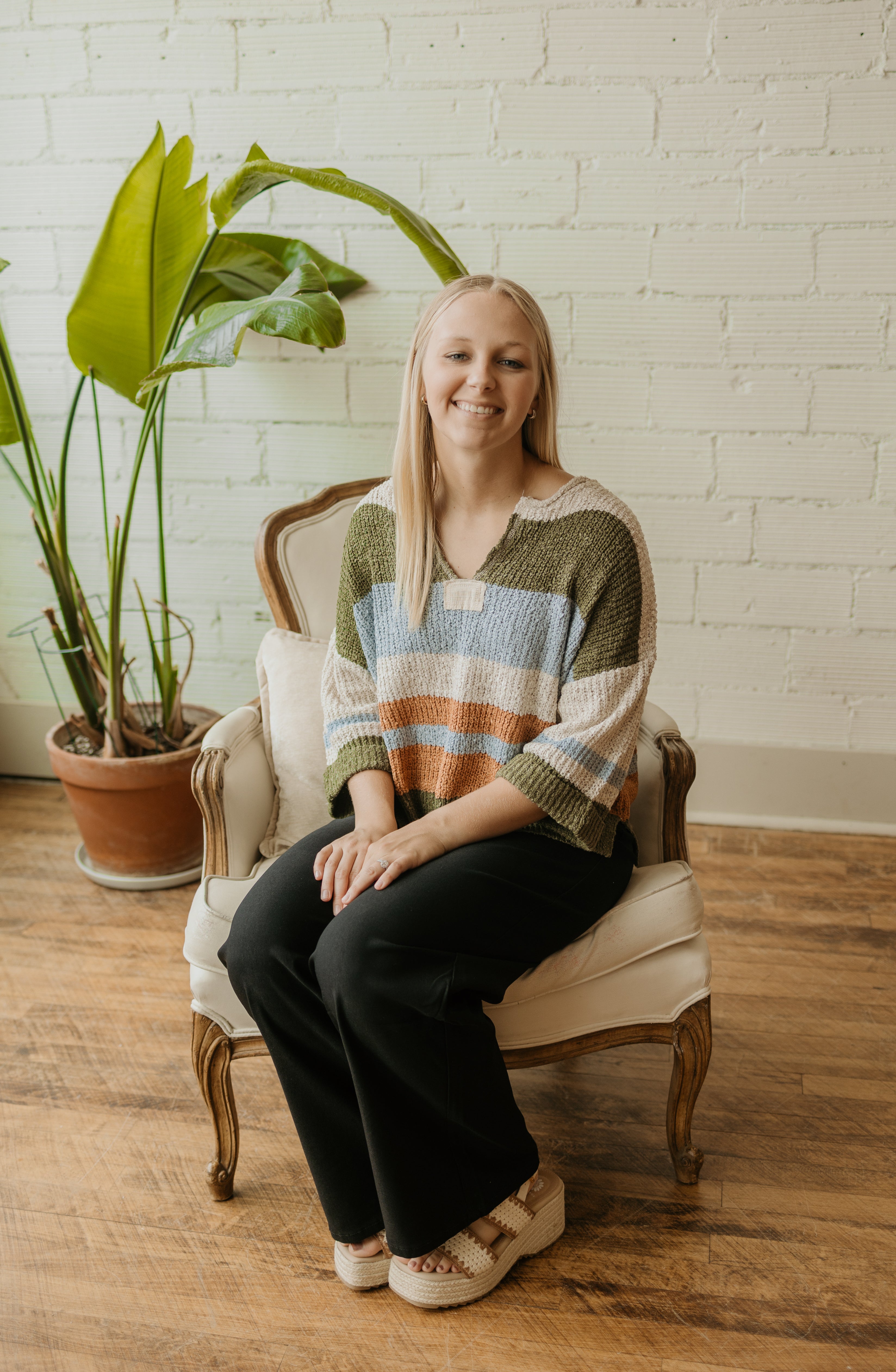 This stripe-textured sweater top brings playful charm with its notched neckline and eye-catching front patch detail. The rolled 3/4 sleeves add a casual twist, while the two side slits and slightly cropped, boxy fit keep it effortlessly cool and comfy. Perfect for layering or wearing on its own, it’s a fun staple to brighten up your wardrobe.