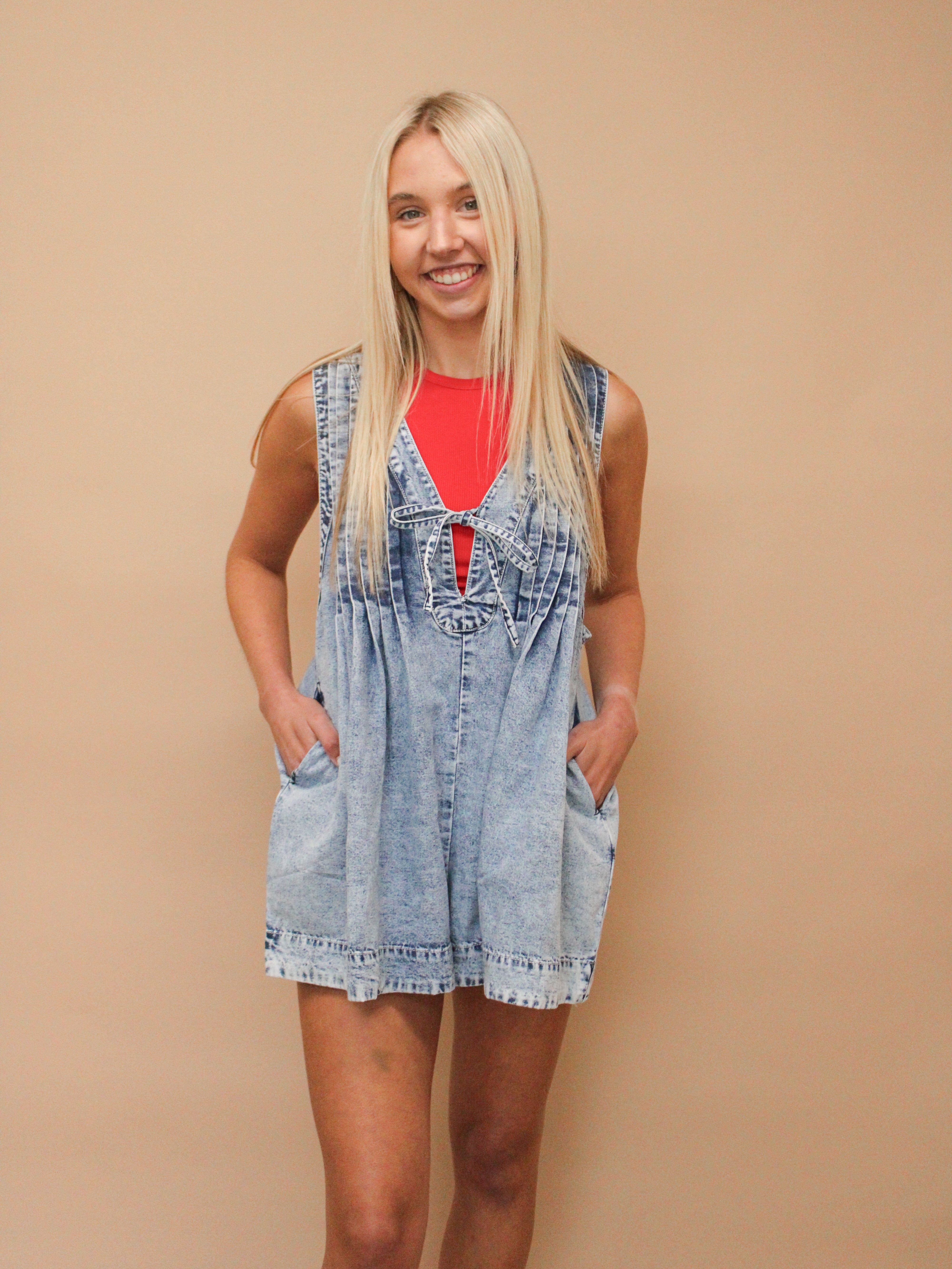 Dive into casual chic with this washed denim sleeveless number! Featuring a flirty deep v-neck with string tie detail that lets you adjust to your perfect fit. The pleated back adds a touch of unexpected flair, while the handy side pocket keeps your essentials close. Perfect for those days when you want to look put-together without trying too hard!