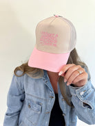 Add a meaningful touch to your everyday style with our What a Friend We Have in Jesus Trucker Hat. Featuring a soft beige crown and a pastel pink bill, this two-tone cap is embroidered with a faith-filled message in vintage-inspired pink lettering. The breathable mesh back and adjustable snap closure make it perfect for sunny days, errands, or simply sharing your faith with fashion.