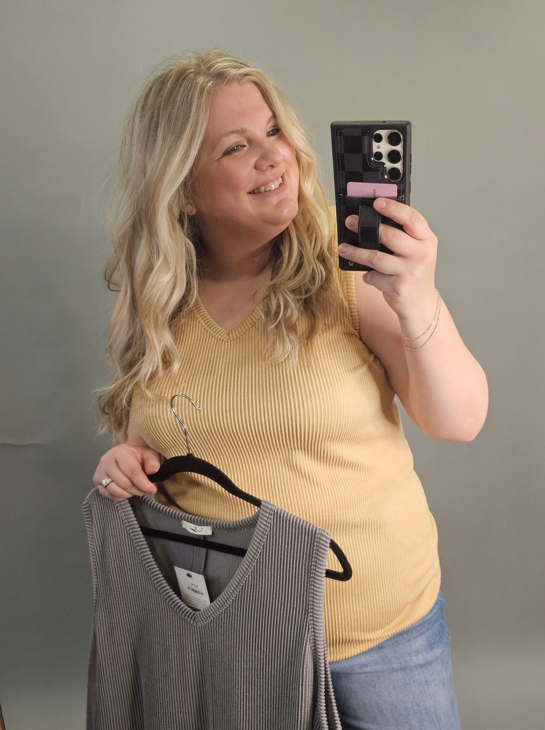 Curvy ribbed vneck tank top pairs perfect under a cardigan