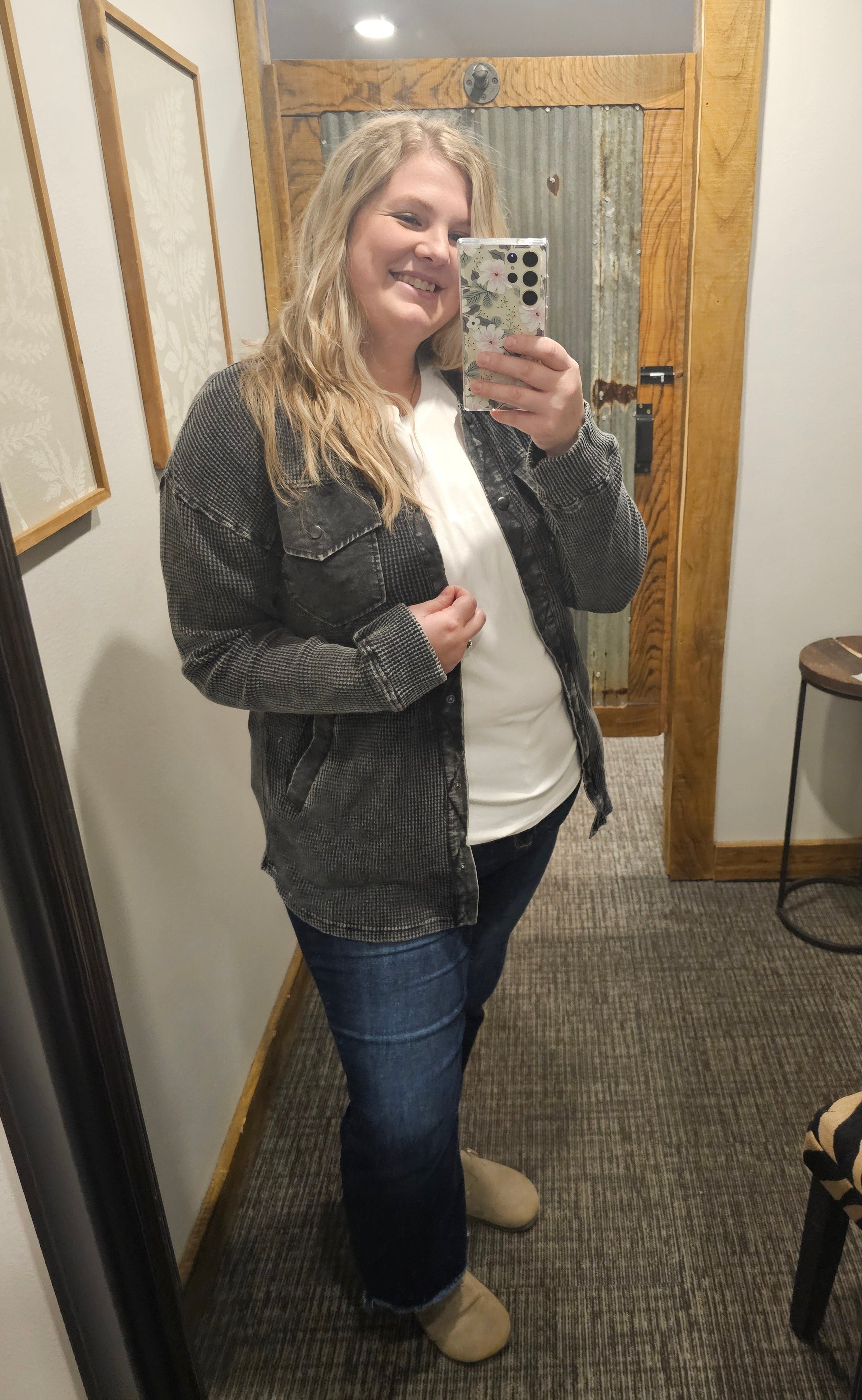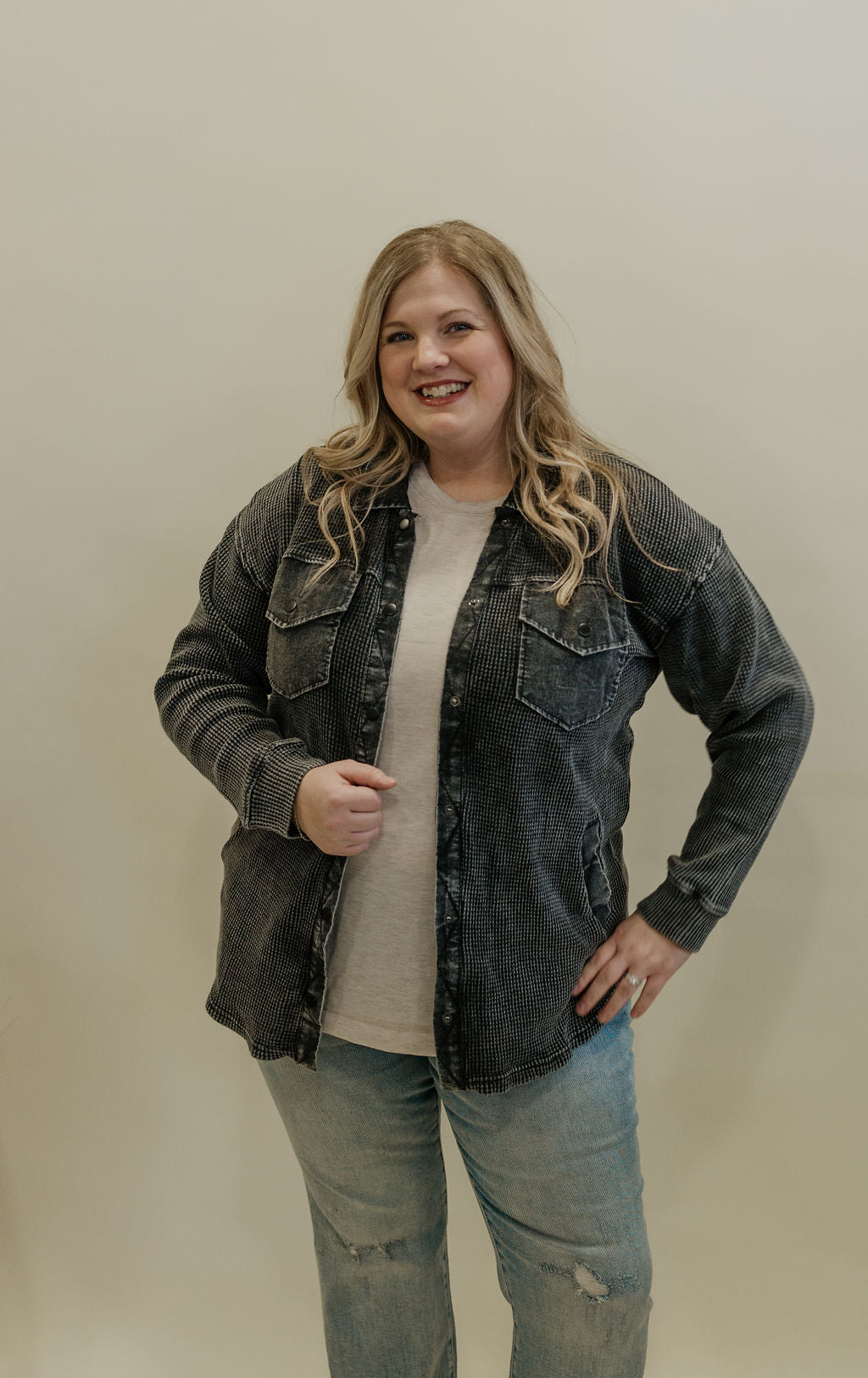 DEENA CURVY WAFFLE KNIT BUTTON DOWN SHACKET