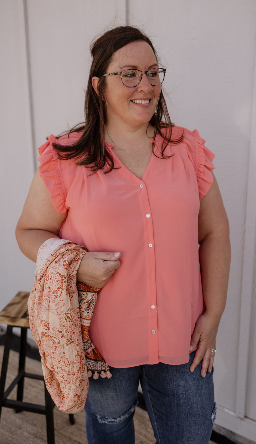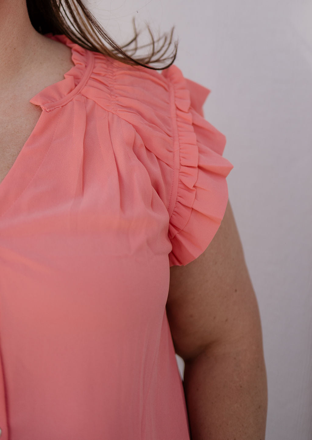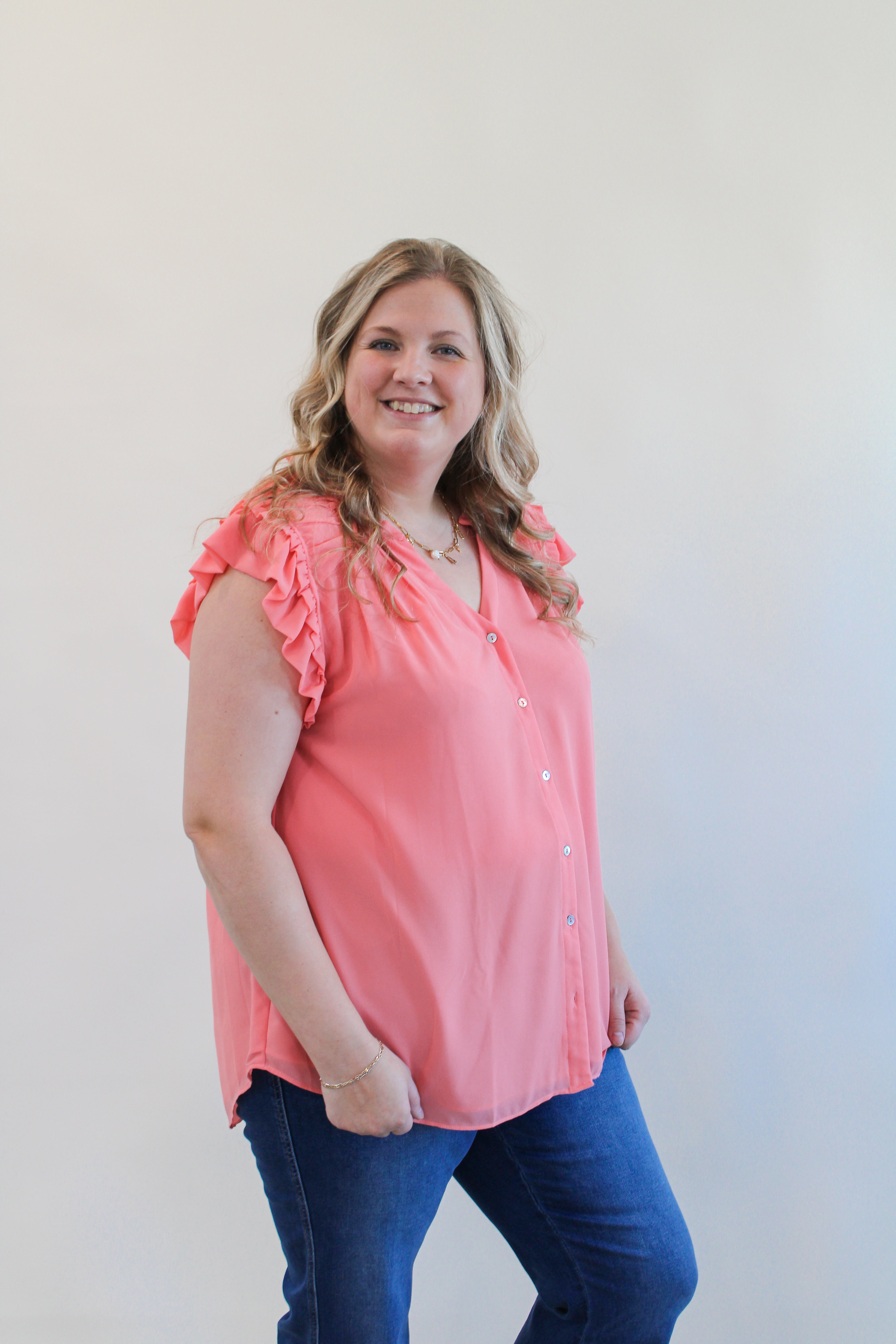 DELLA CURVY CORAL BUTTON DOWN TANK WITH RUFFLE DETAIL