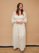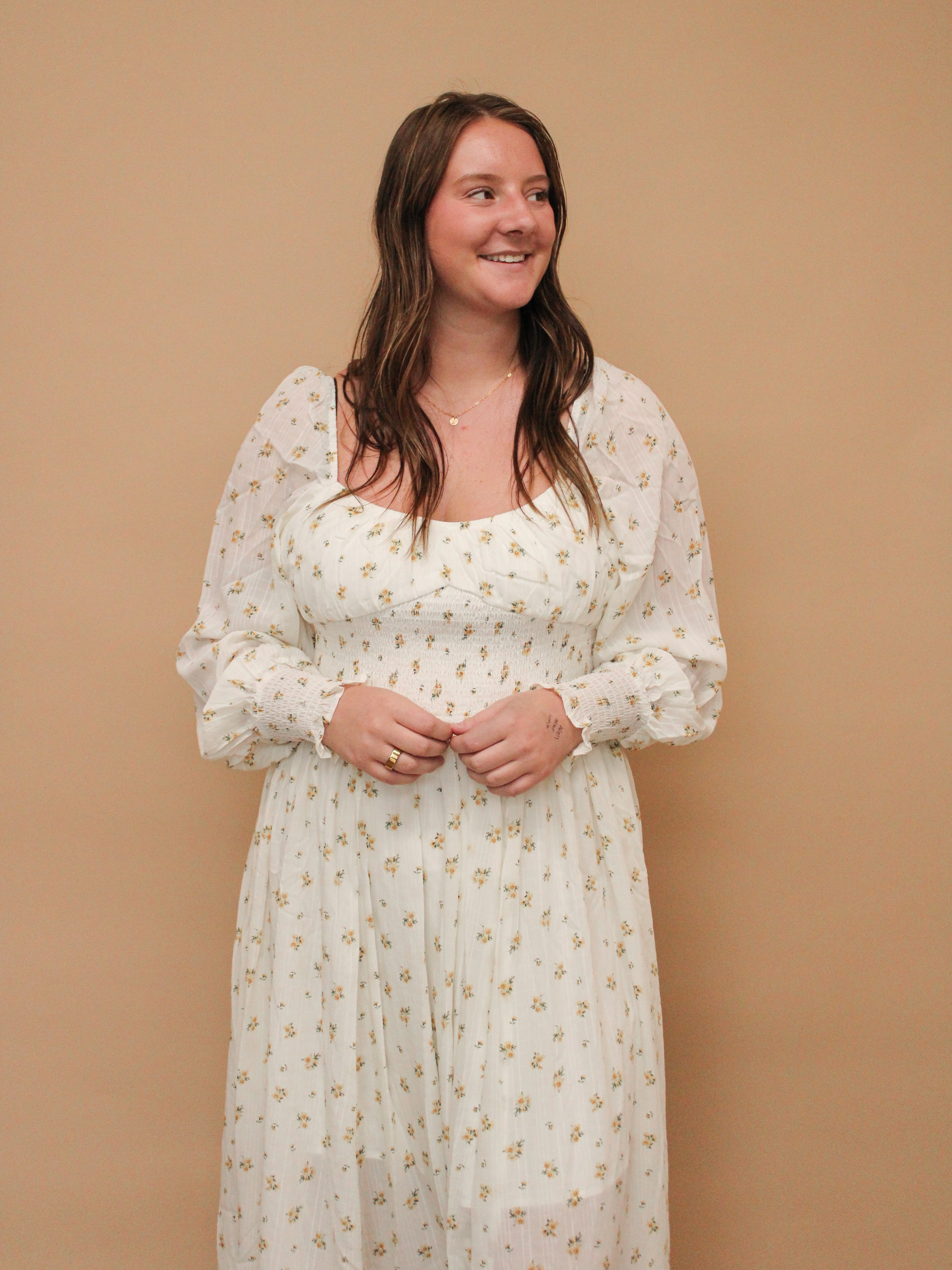 Embrace your inner flower child with the MACI FLORAL MAXI DRESS. This white dress features a dainty floral print and long sleeves for a charming boho vibe. The elastic waist and wrists provide a comfortable fit, while the maxi length adds a touch of elegance. Perfect for adding some whimsy to your wardrobe!