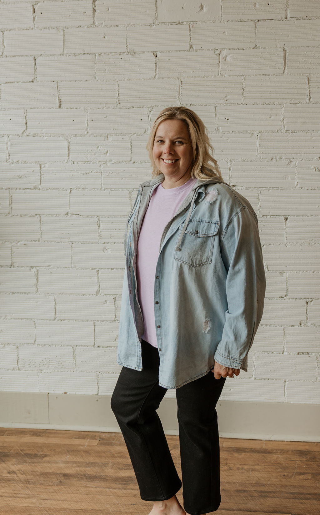 Light washed denim jacket with hood detail, does have a zip up closure