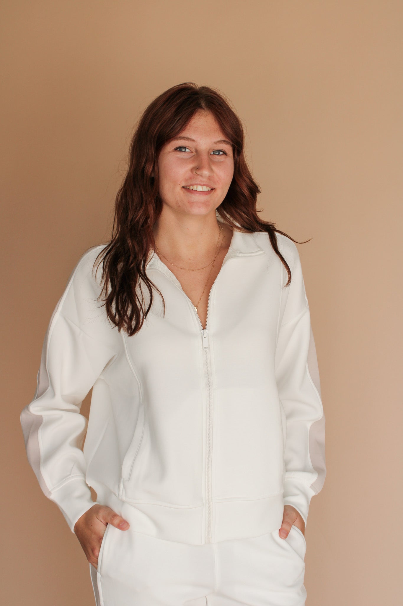 Elevate your sporty style with the Jessi Scuba Zip Up Jacket! Made from silky smooth, lightweight modal poly span scuba fabric, it offers a relaxed fit that feels like a dream. The playful color contrast striping along the sleeves adds a fun twist, while the mock neck and full zip closure keep things sleek. With handy side pockets and long sleeves, it’s perfect for layering on the go. Whether you’re out and about or just lounging, this jacket brings comfort and flair together effortlessly.