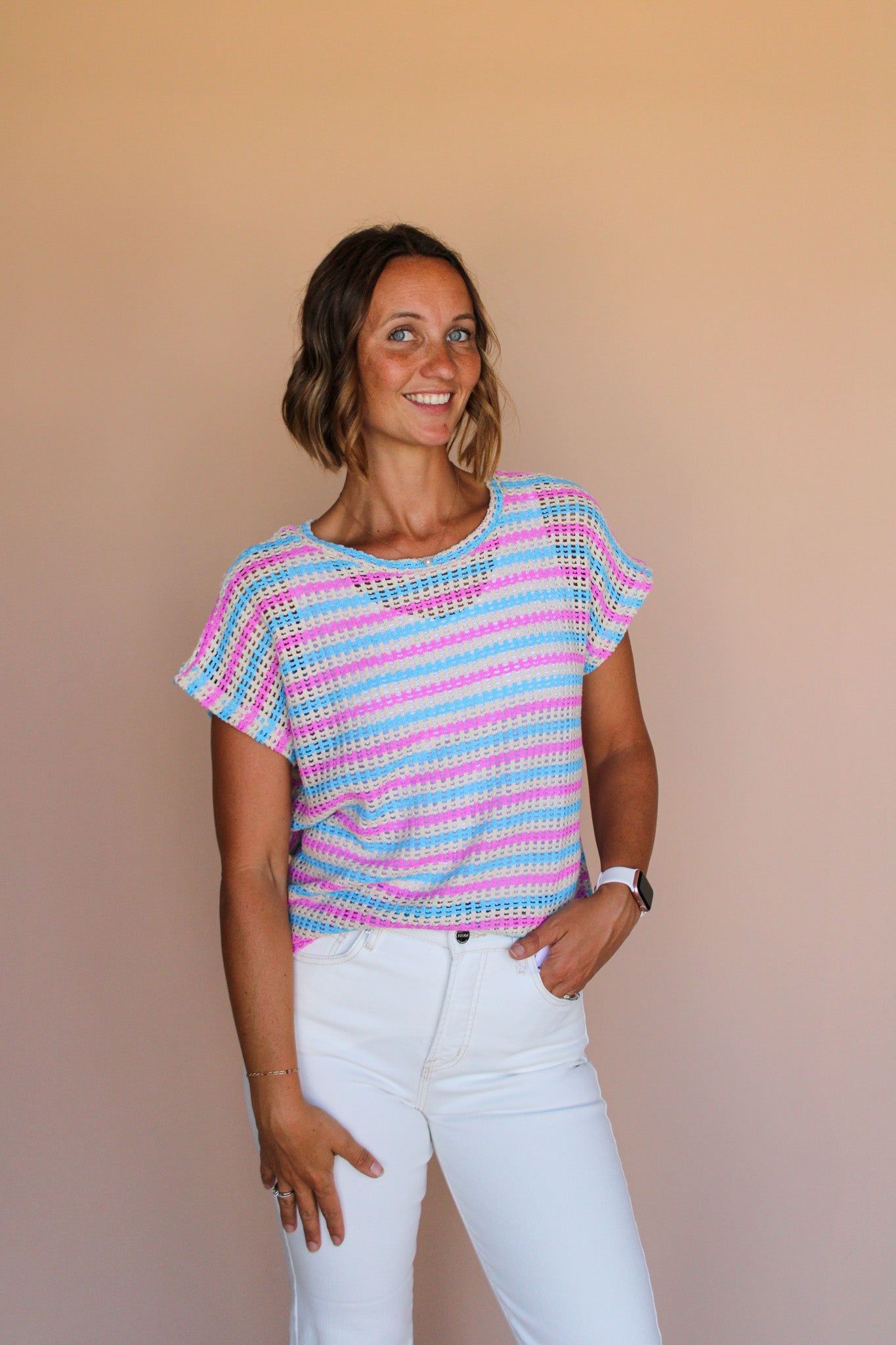 Get ready to turn heads with our CAMI striped crochet top! This open knit, multi stripe top is not only stylish, but also features a round cut neckline and dolman sleeve for a comfortable and flattering fit. Perfect for any occasion, this top will quickly become a wardrobe favorite.