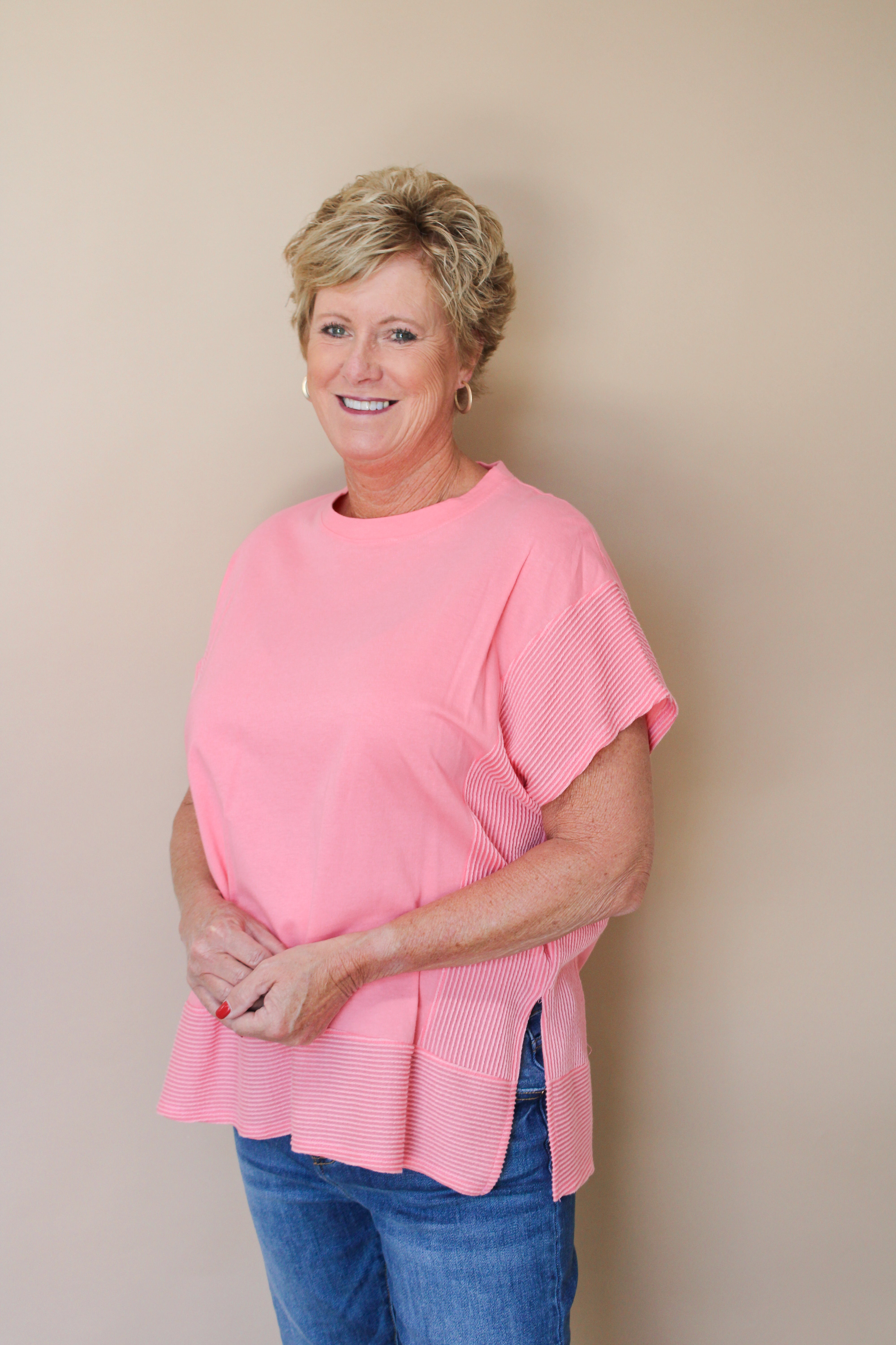 Casual round neck top with ribbed side and bottom detail