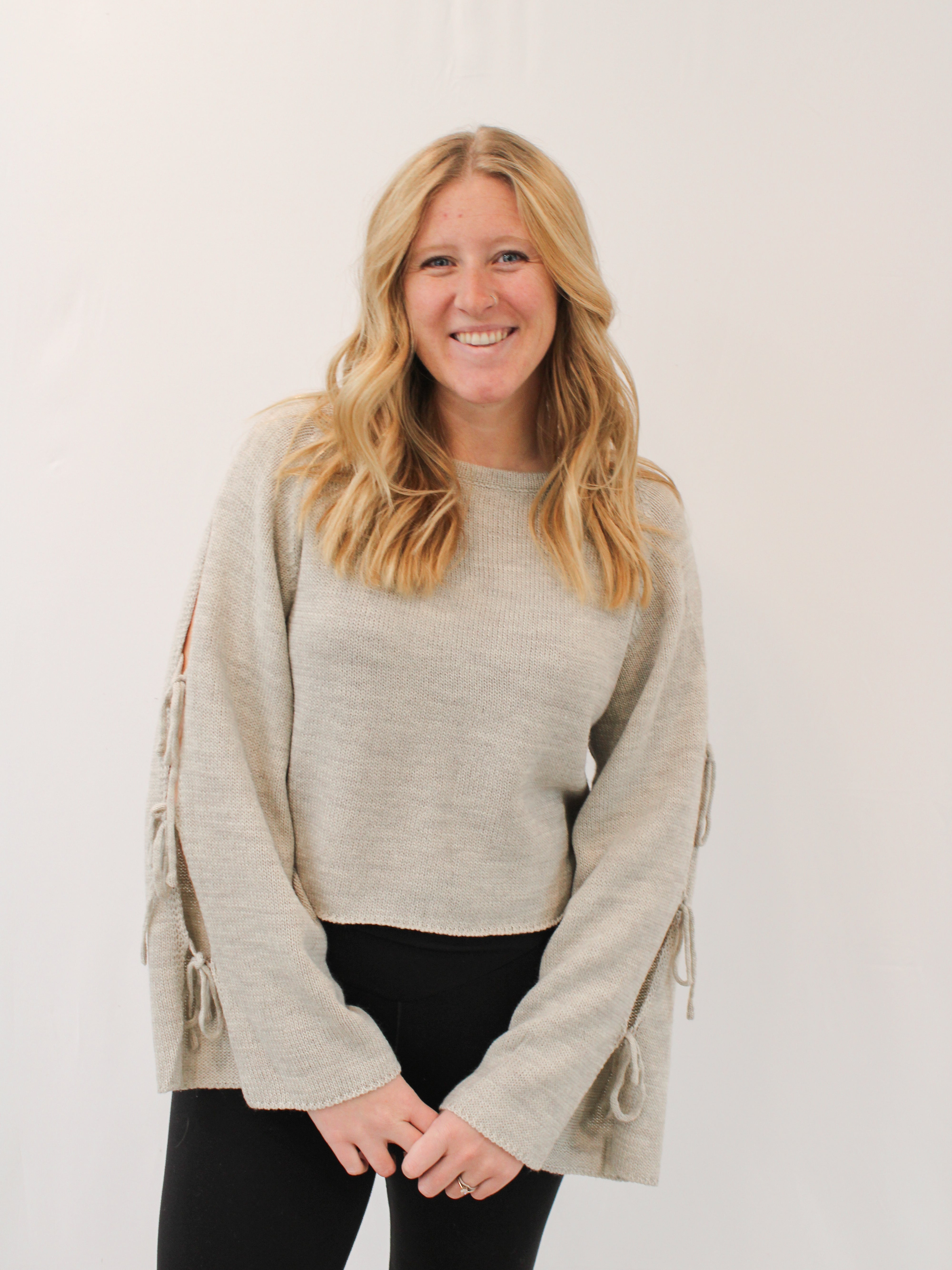 This brushed grey sweater features a playful ribbon tie sleeve, adding a touch of quirkiness to a classic long sleeve style. Perfect for lounging or running errands (or both!), this sweater will keep you warm and stylish.