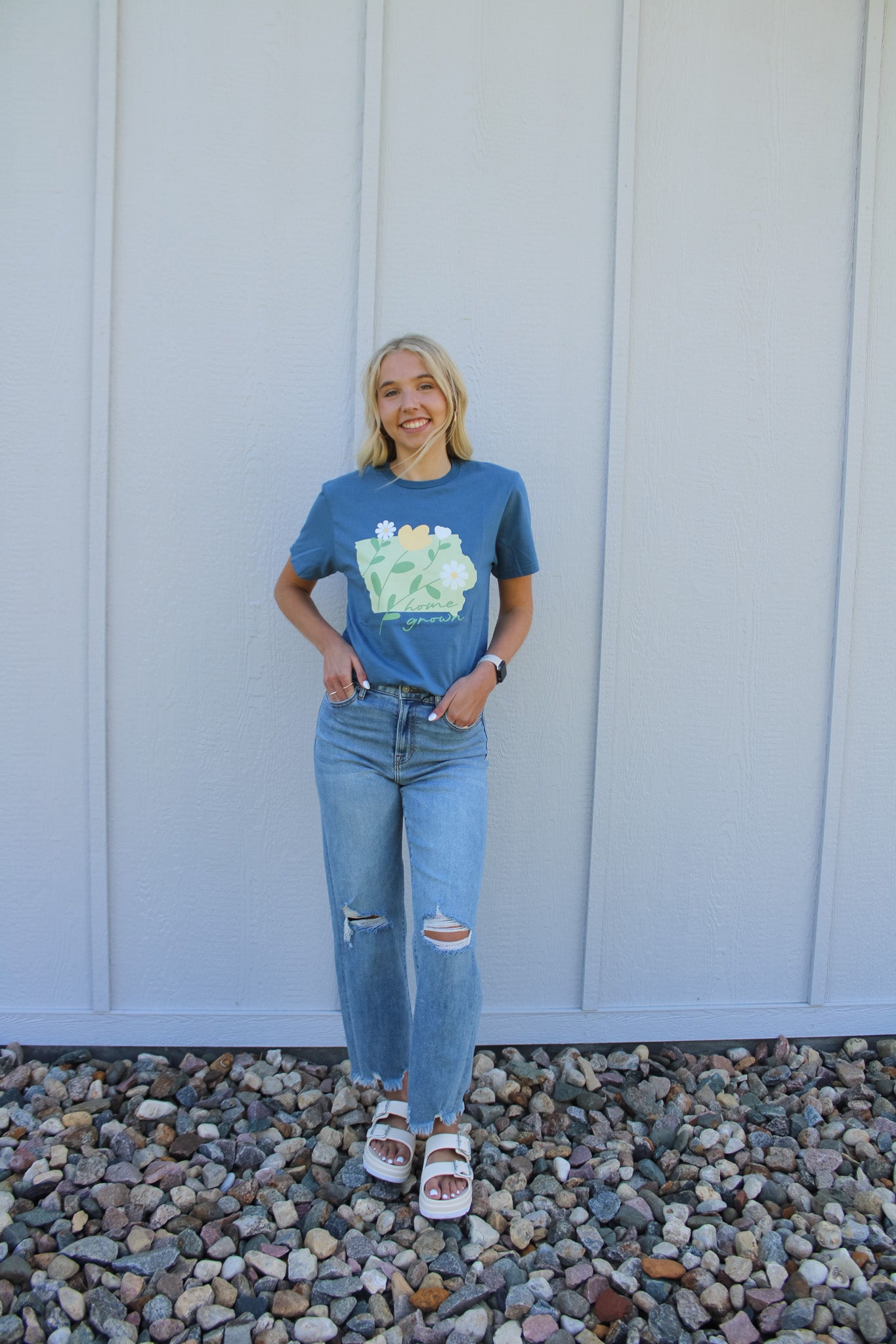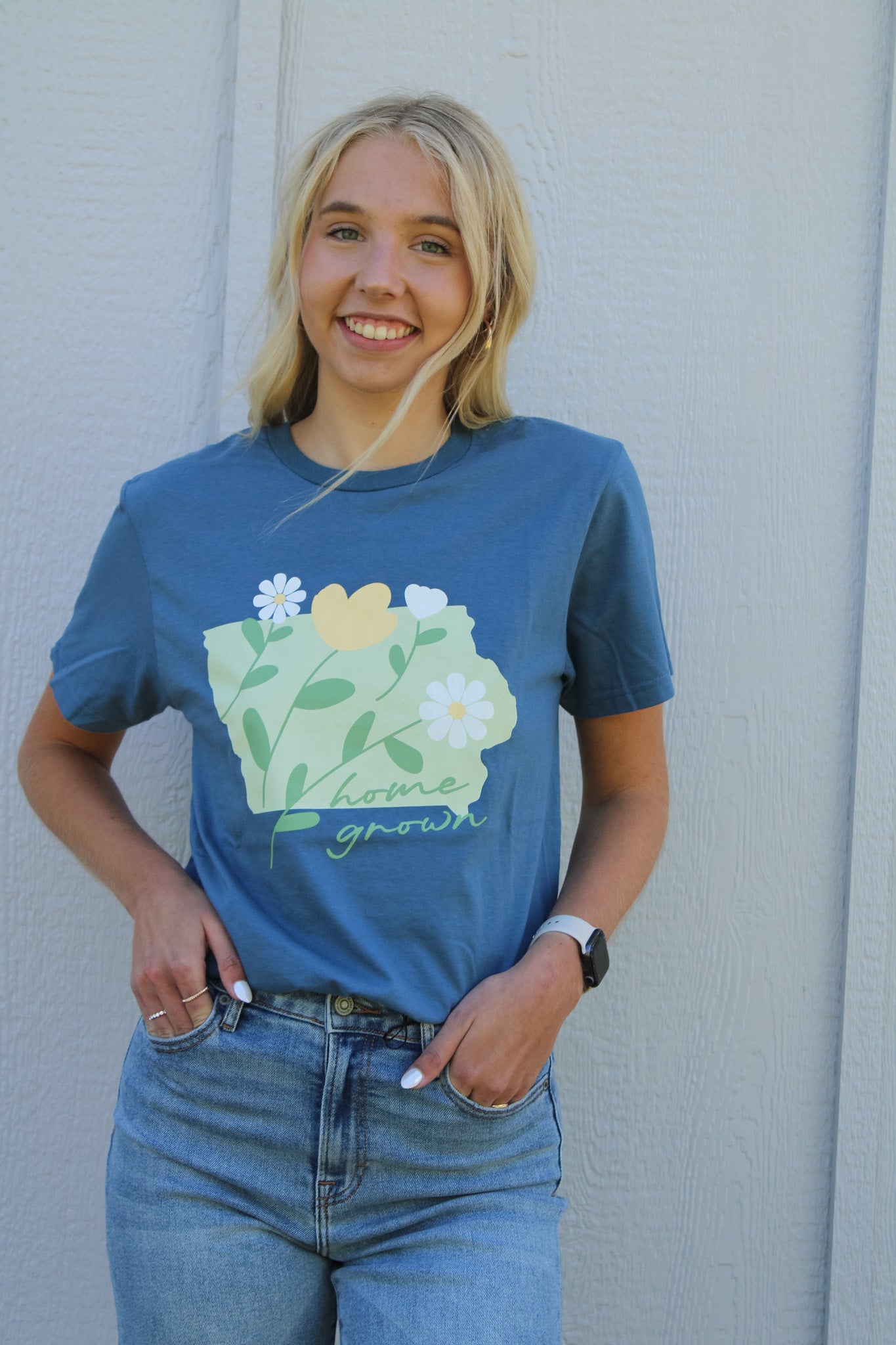 This indigo blue graphic tee pops with a vibrant, full-color imprint that proudly reads “Home Grown” across the chest. Nestled within the design is the outline of the state of Iowa, filled with a lively, multicolored pattern that gives a fresh, cheerful feel. Perfect for showing off your Iowa roots in style, it blends hometown pride with a bold, eye-catching look.