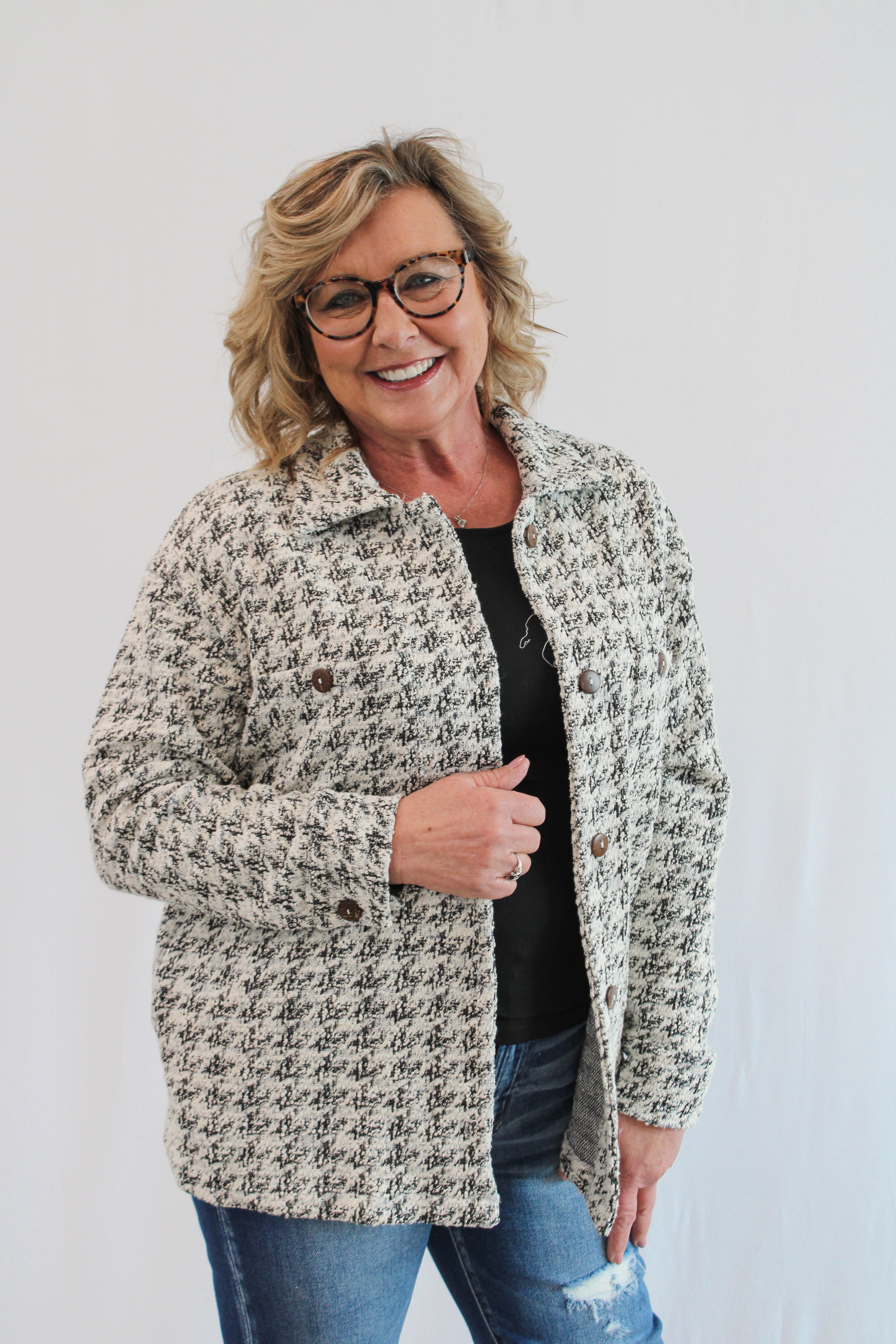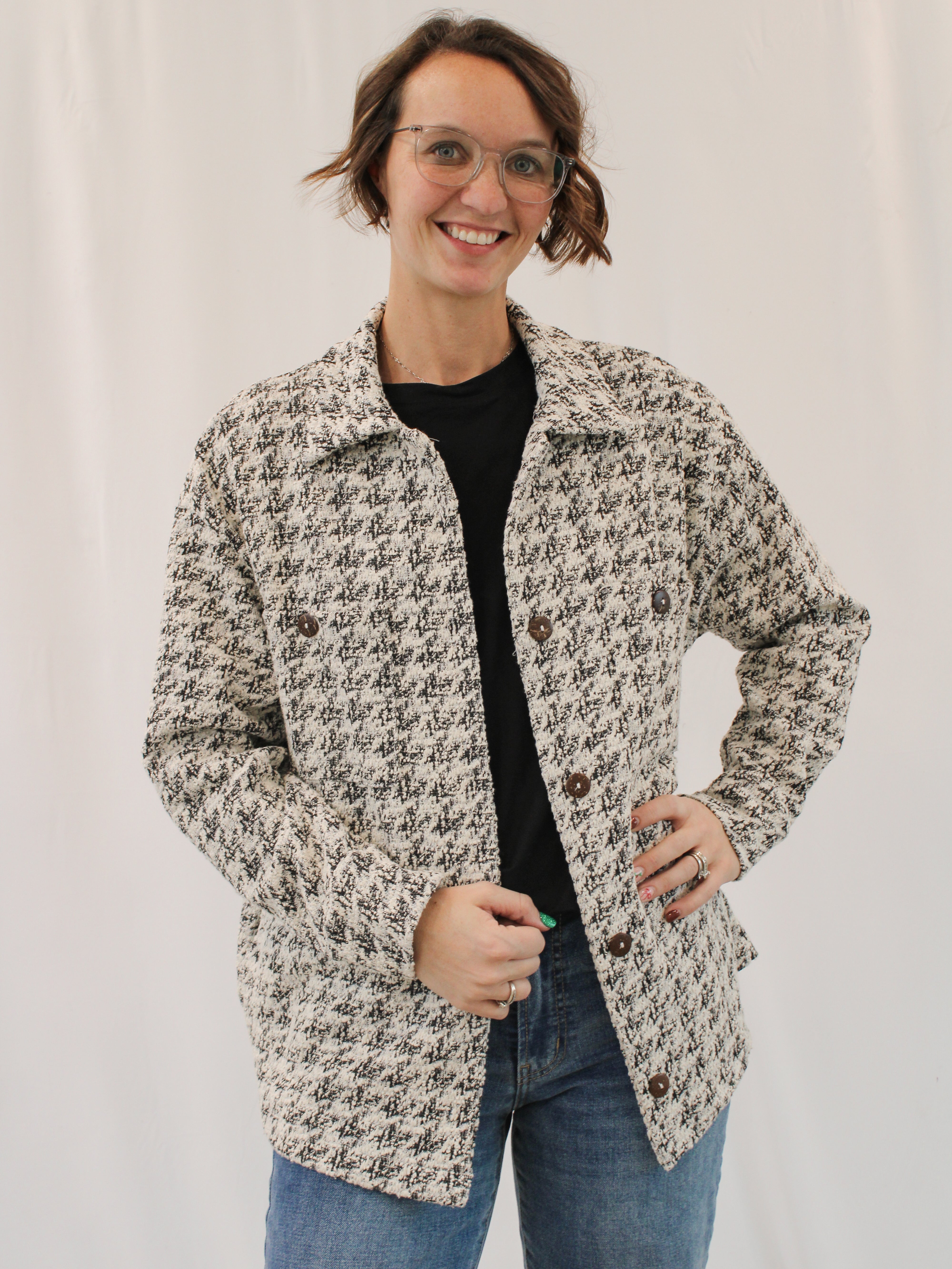Stay stylish and cozy with our KIRI REG/CURVY HOUNDSTOOTH SHACKET. This black, cream, and white lightweight shacket is perfect for any season. Its longer length and button-down design provide both comfort and style. Upgrade your wardrobe with this versatile piece.