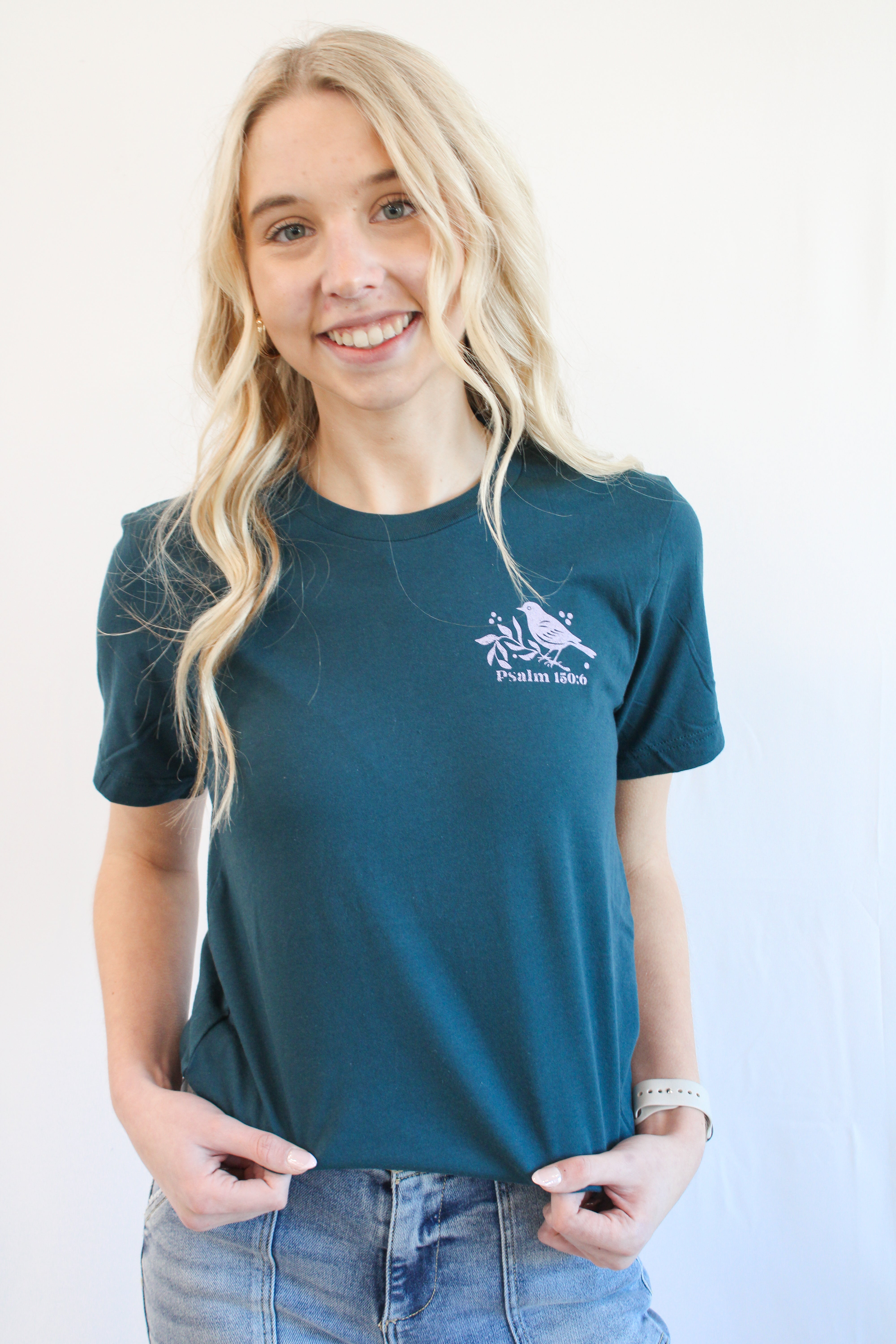 Let Everything That Has Breath, Praise the Lord! Psalm 150:6 imprinted in a beautiful lavendar color on a beautiful atlantic blue Bella+Canvas crewneck t-shirt.