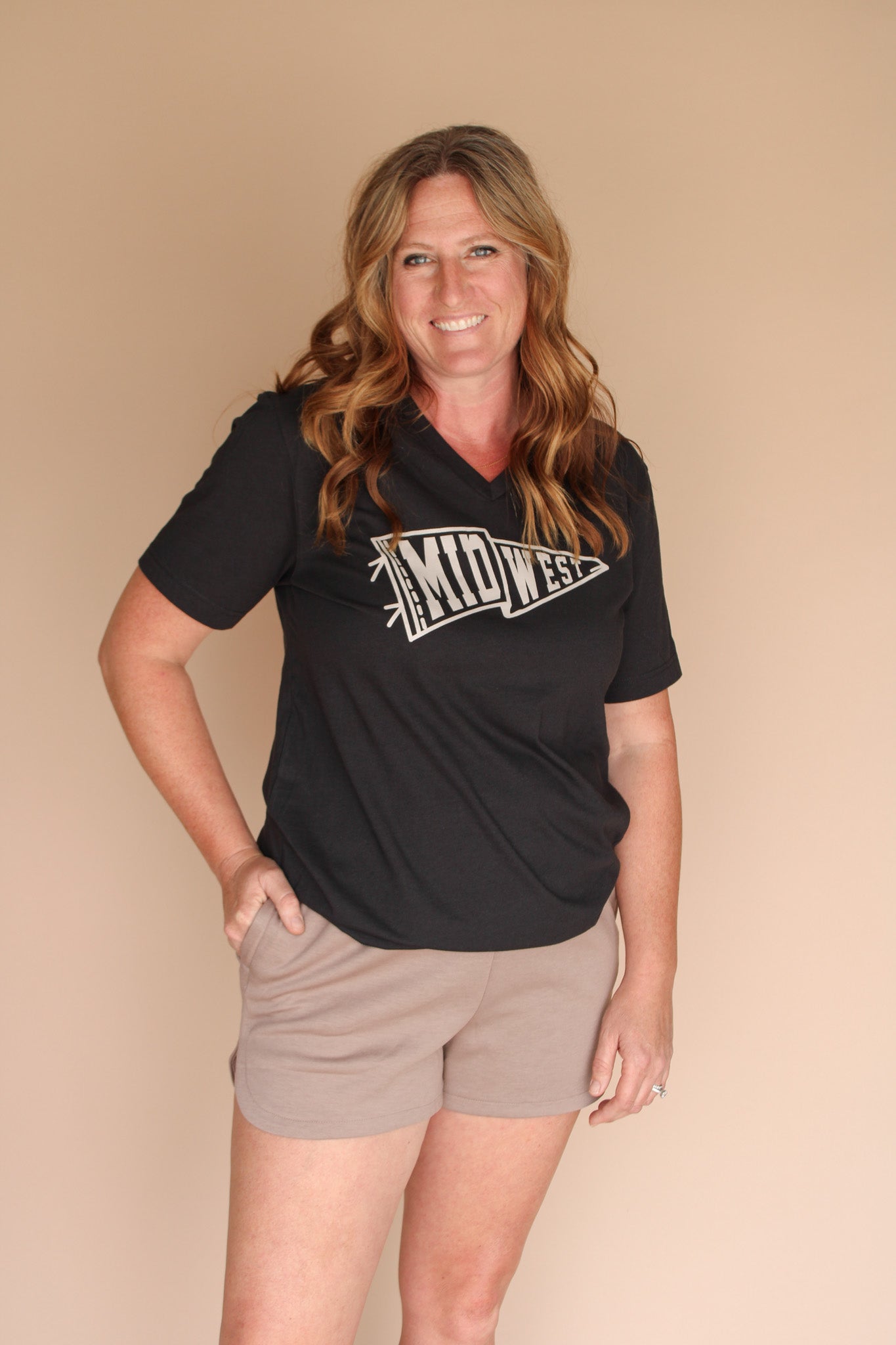 Simple. Classic. Proud. This vintage black v-neck tee features a clean “Midwest” imprint that says it all. Designed for laid-back days and hometown hearts, it blends a flattering fit with go-with-everything style. The soft, worn-in fabric makes it feel like an old favorite from the first wear, while the bold white lettering keeps your Midwest pride front and center. Dress it up with denim and boots or keep it casual with joggers and a ball cap — either way, it's a staple for anyone who calls the heartland home.