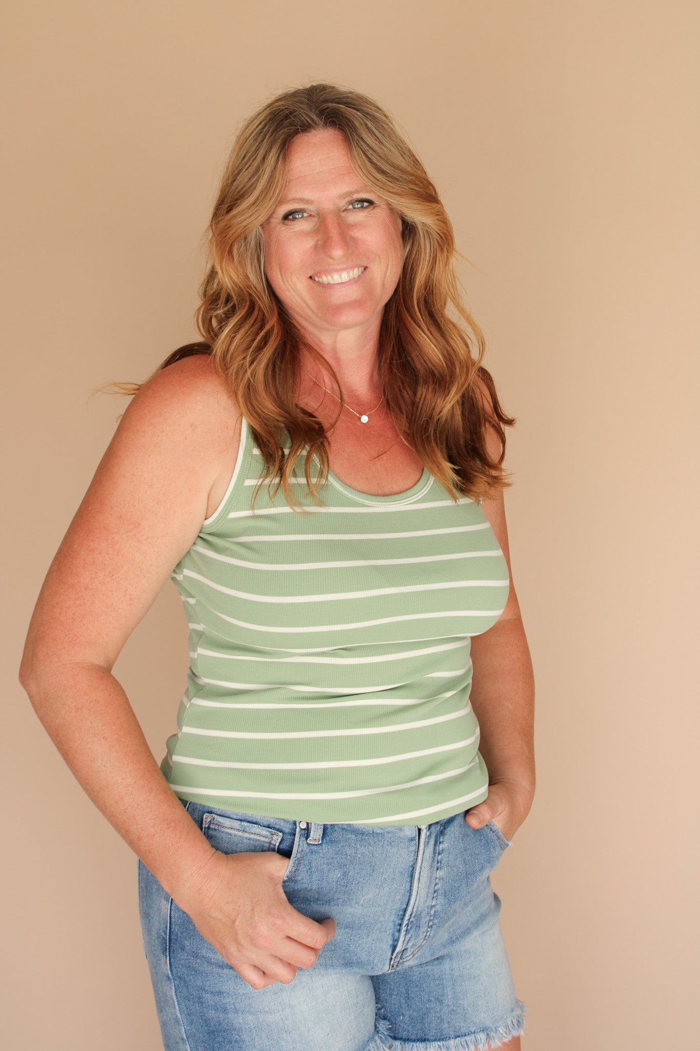 This sleeveless fitted tank features a playful striped pattern and a classic round neckline, perfect for adding a fun, flirty touch to your summer wardrobe. Its snug fit highlights your silhouette while keeping you cool and comfortable all day long.
