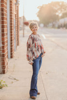 Cute top paired with denim or black pants. Model is wearing size small - fit is true to size.