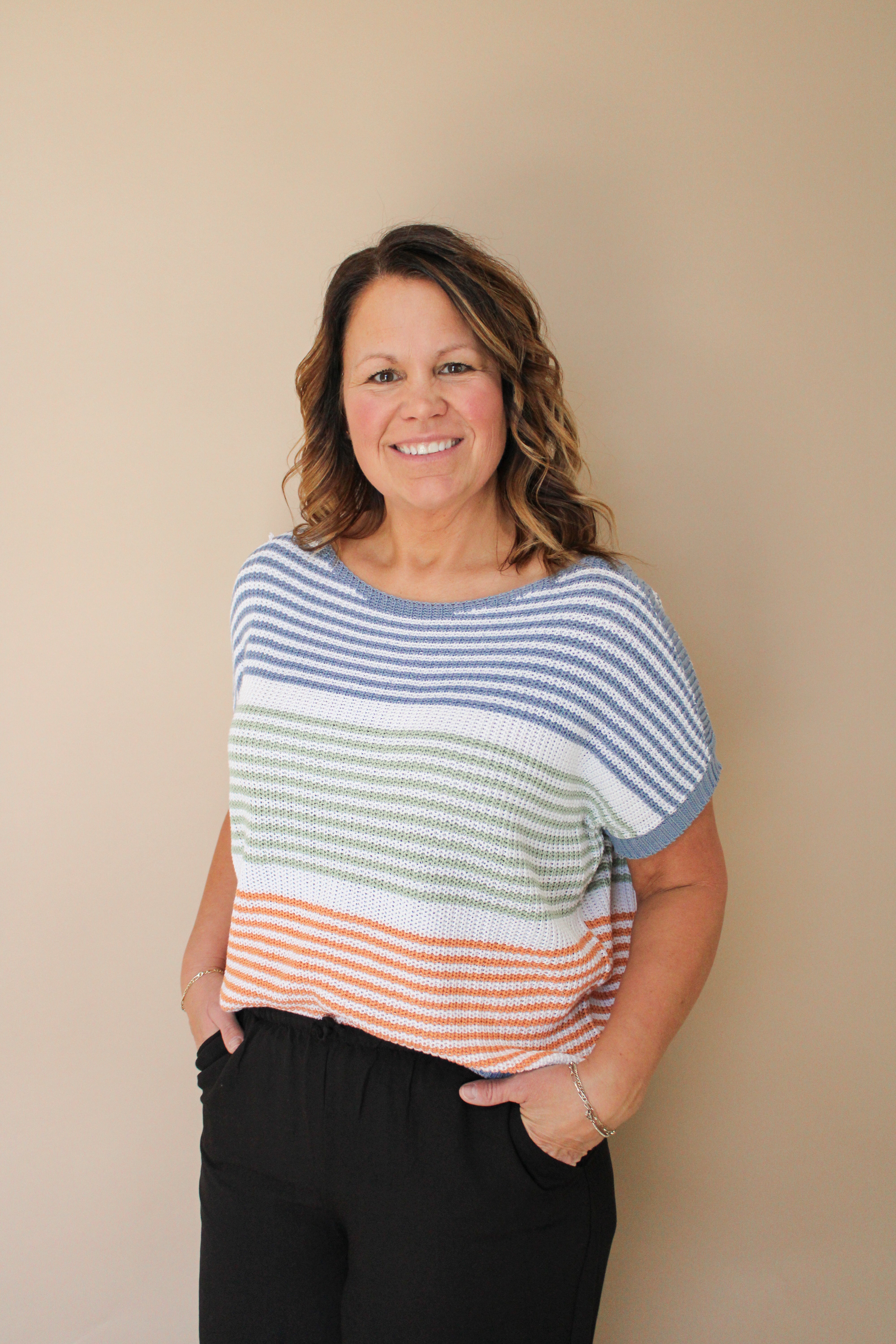 Add a pop of color to your wardrobe with the TEAGAN striped short sleeve sweater! Its relaxed fit body and ribbed details make this top both stylish and comfortable. Perfect for any occasion, this sweater features multi-color stripes and short dolman sleeves for a playful and fun look.
