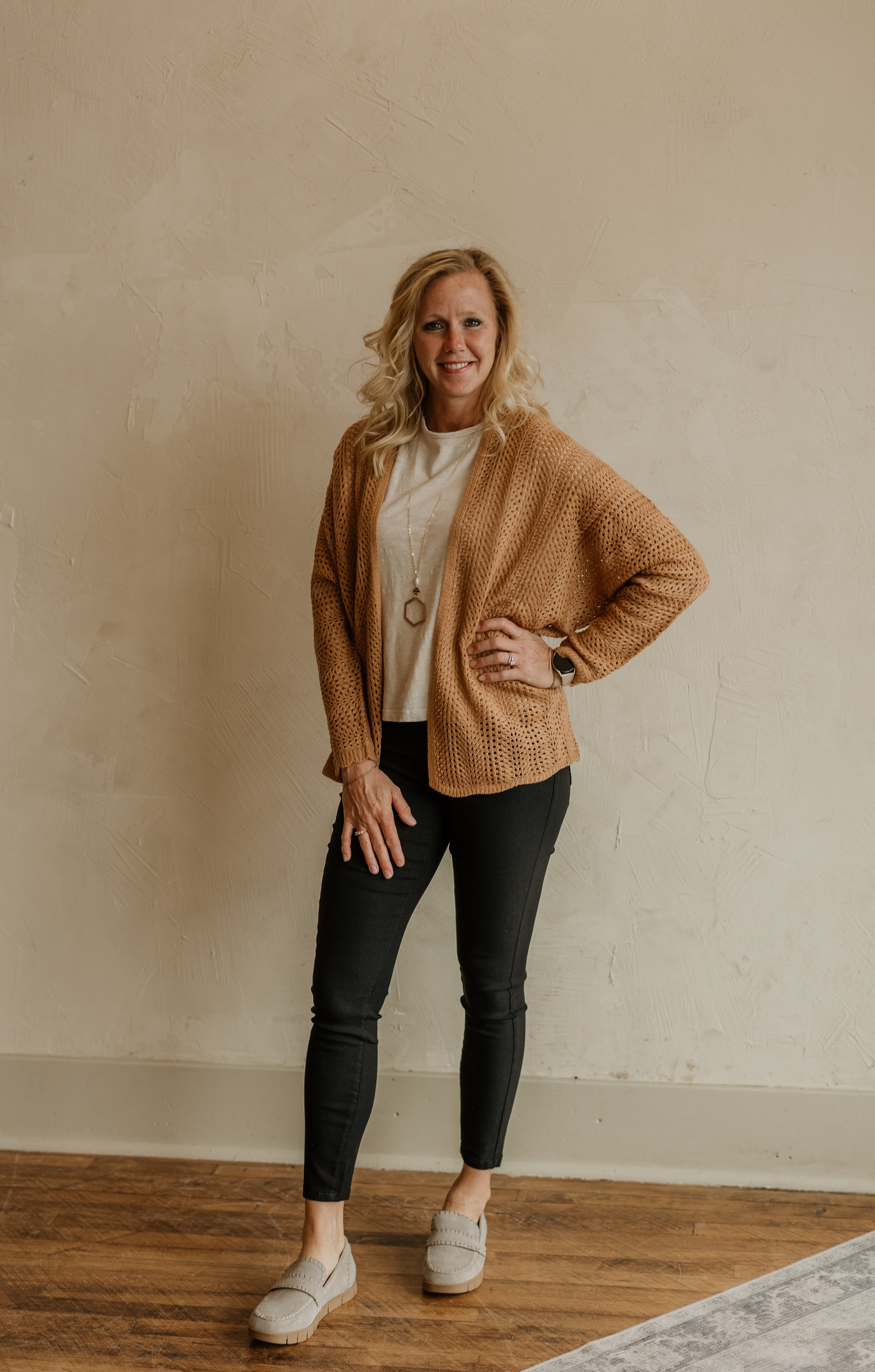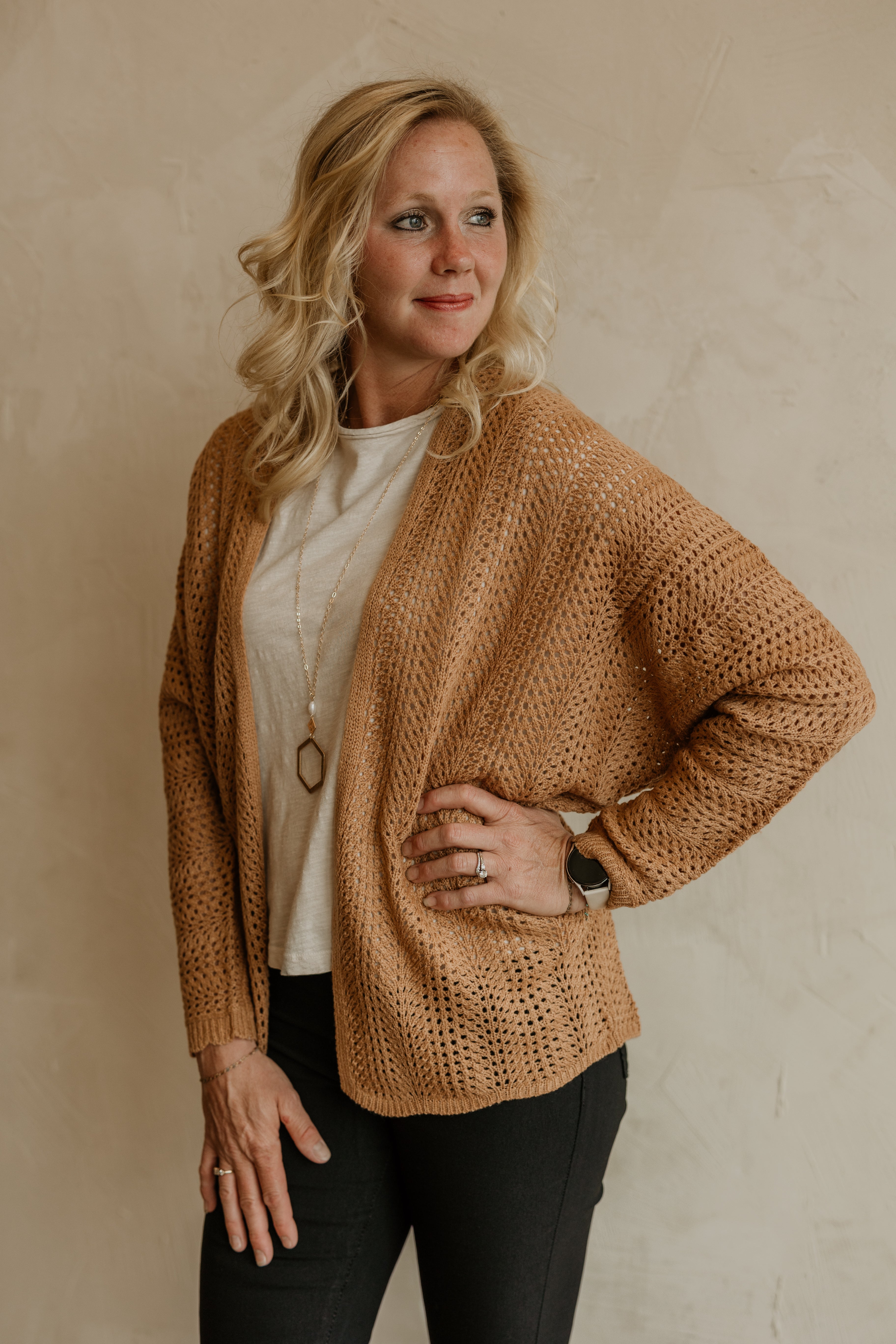 Wrap yourself in cozy charm with the Theresa Crochet Dolman Sleeve Cardigan. Its chunky crochet texture and rich caramel hue bring warmth and style to any look. The relaxed dolman sleeves add playful volume, making it perfect for layering on cool days while keeping you effortlessly chic.