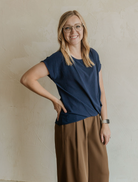Navy blouse with round neck and front tie detailing