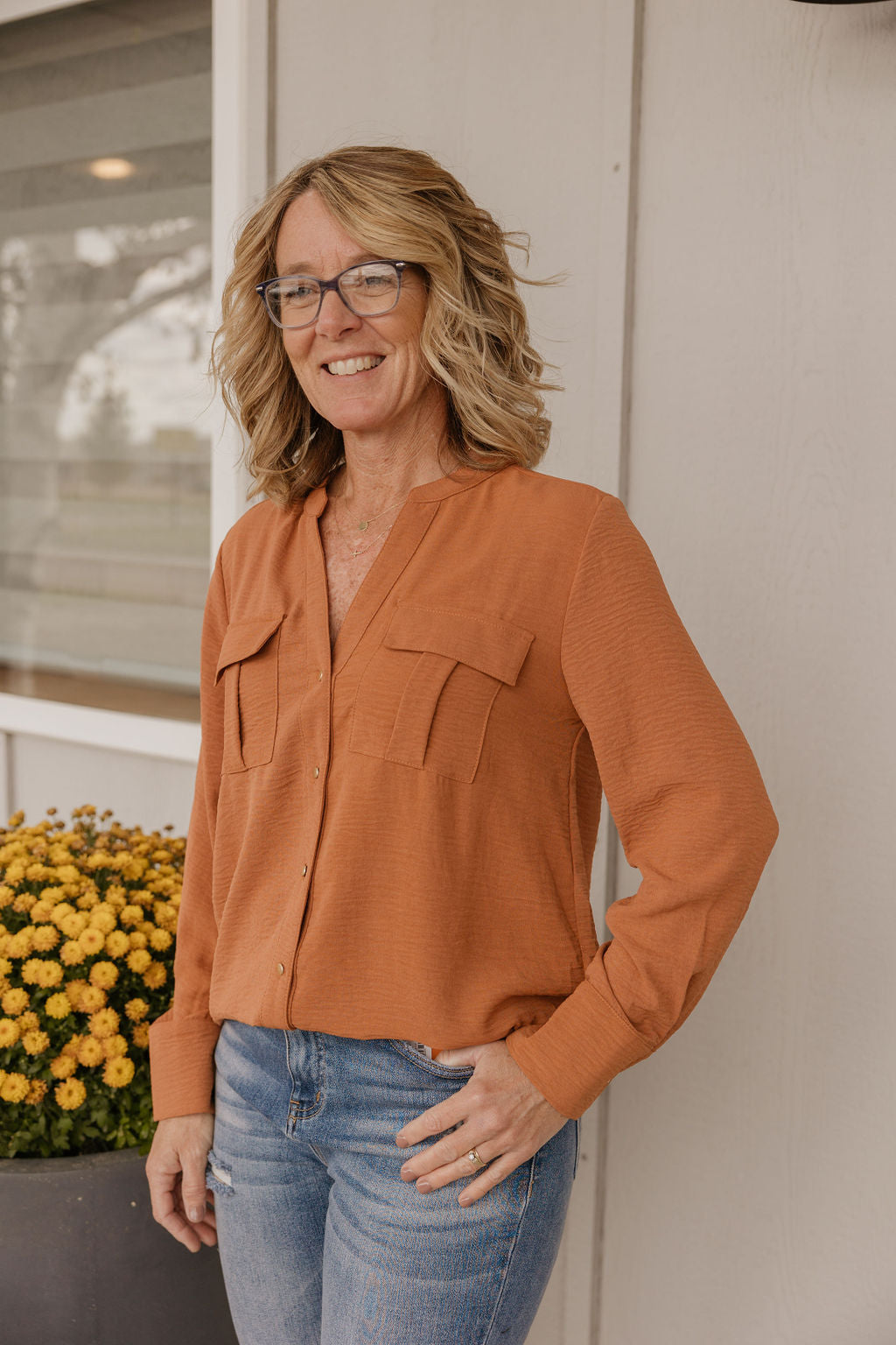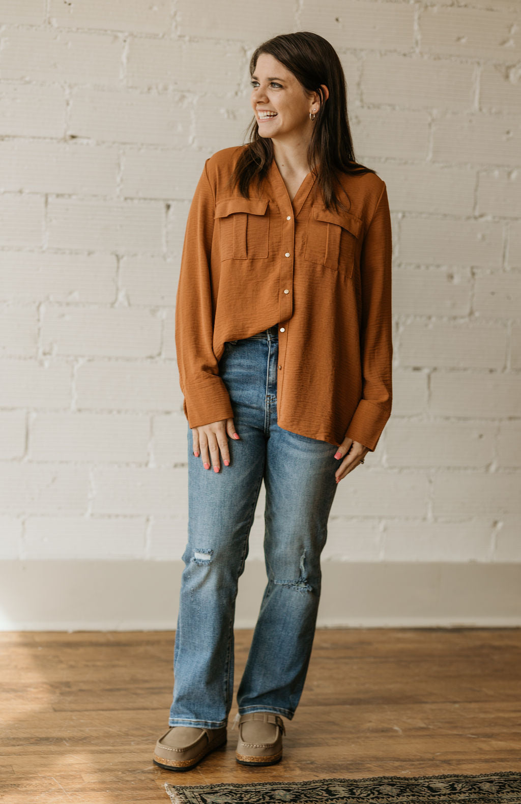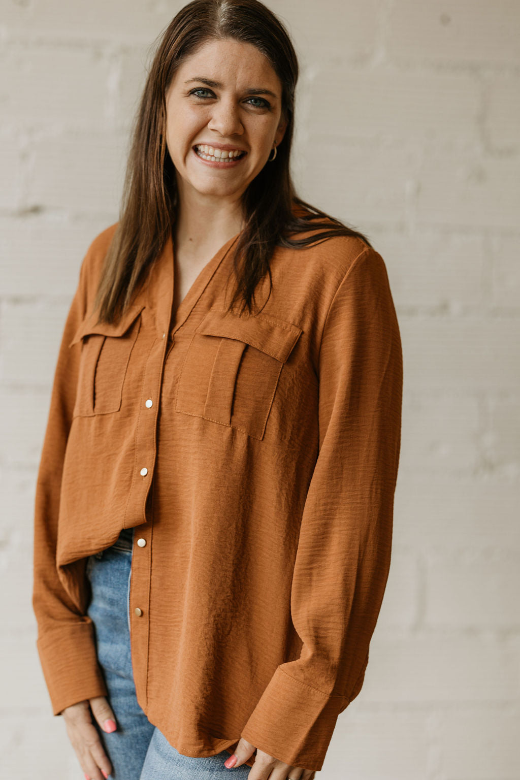 CAITLYN BUTTON DOWN CAMEL BLOUSE