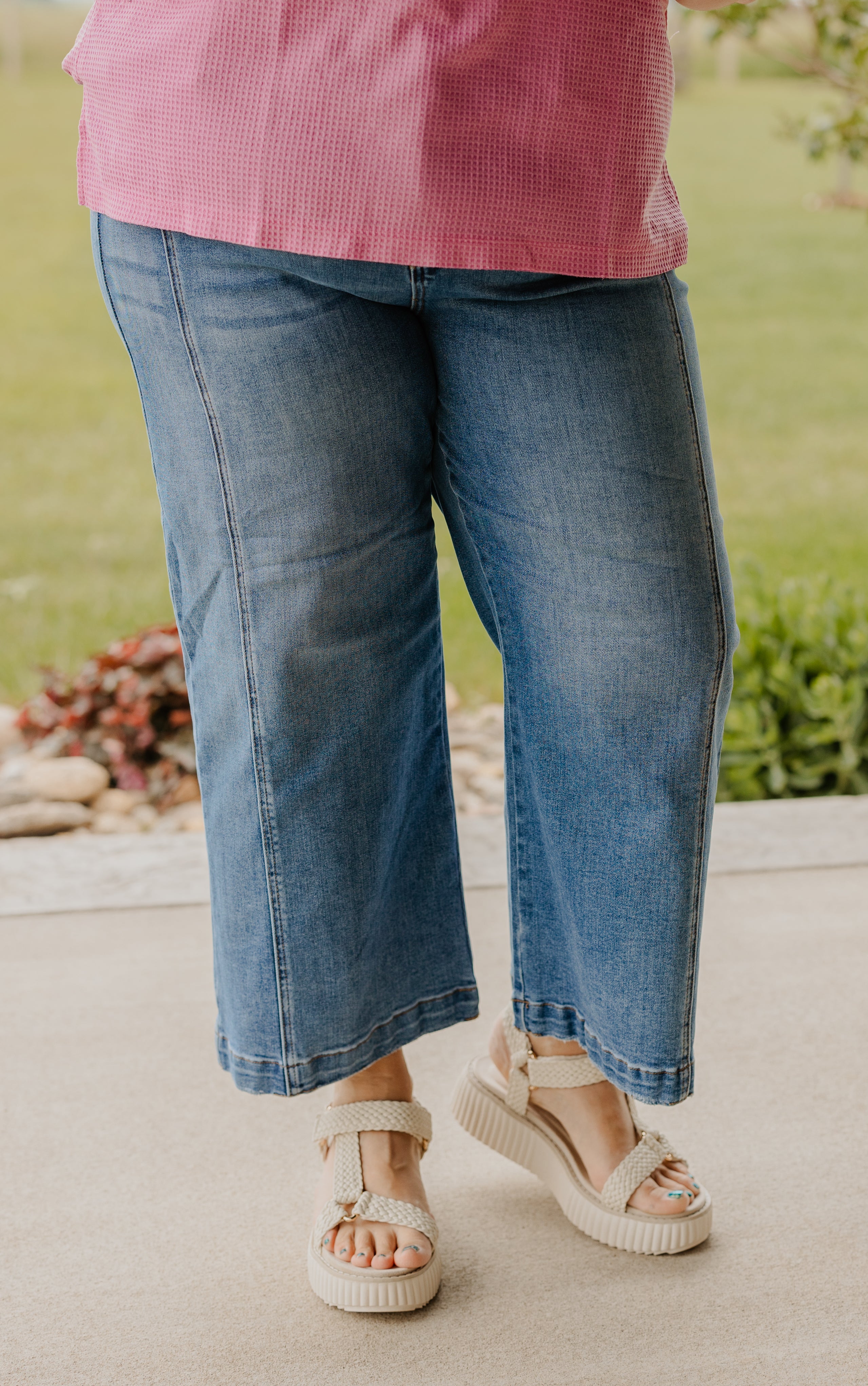 Step into style with the BRIDGET High Rise Front Seam Wide Leg Crop jeans. Featuring a flattering high waist and a trendy wide-leg cut, these cropped jeans add a fun twist to your everyday look. The unique front seam detail brings a playful edge, making them perfect for mixing and matching with your favorite tops and shoes. Comfortable and chic, they’re ready to elevate your wardrobe with a splash of personality.