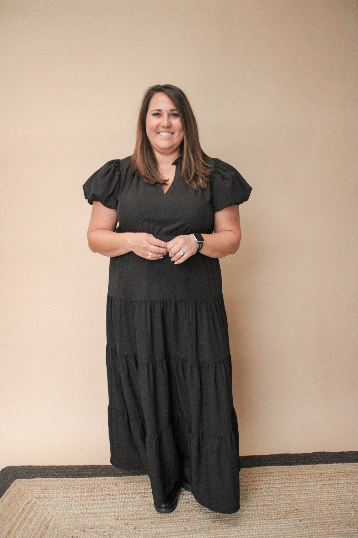 Celebrate your curves with the AZLYNN Curvy Tiered Dress, designed to flatter every shape. Featuring playful puff sleeves and a flattering V-neck, this dress adds a touch of whimsy to your wardrobe. Its tiered skirt flows beautifully, creating movement and fun with every step. Perfect for days when you want to feel confident, comfortable, and effortlessly stylish.