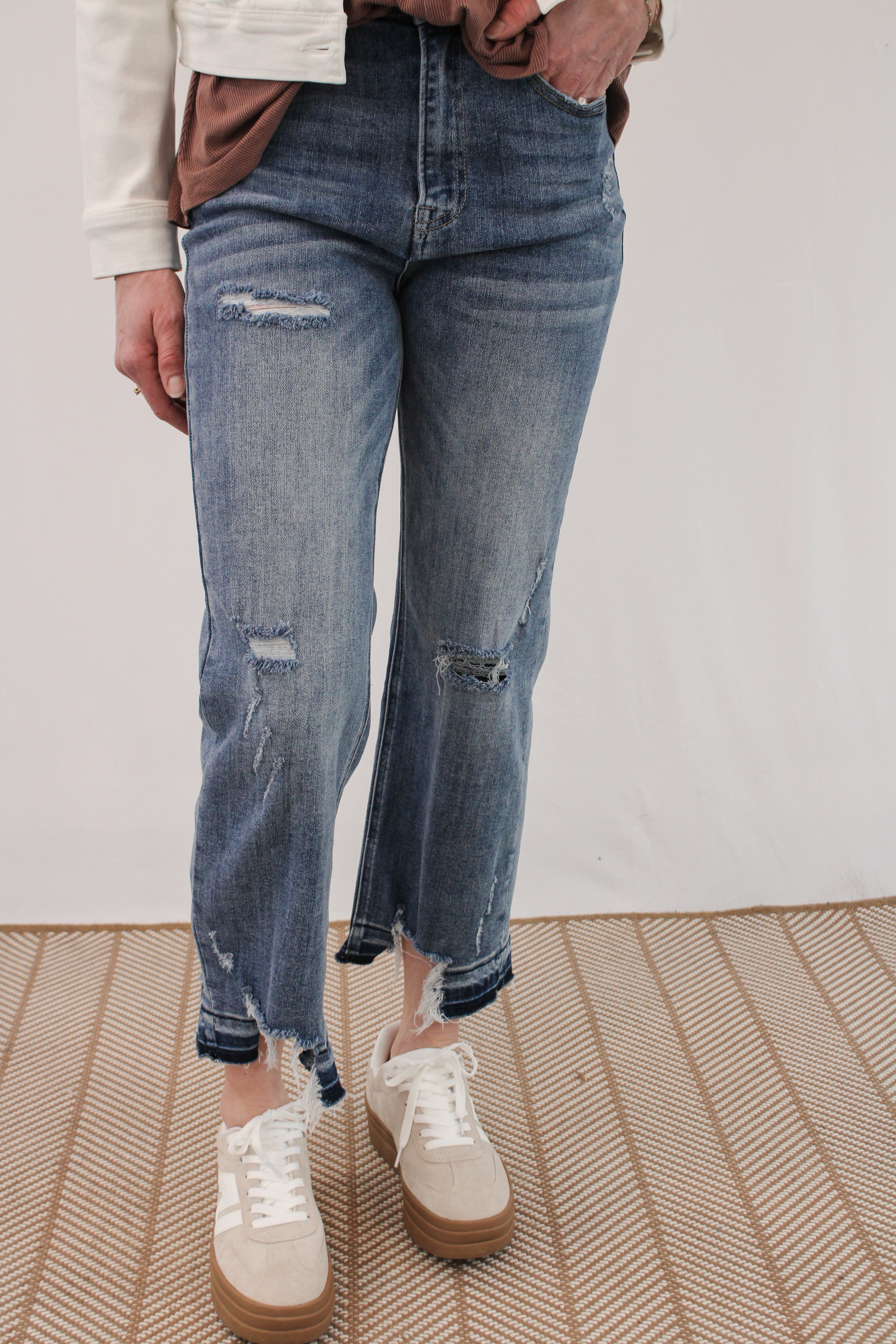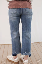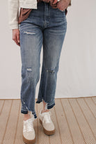 Medium washed high rise cropped straight jeans with distressing