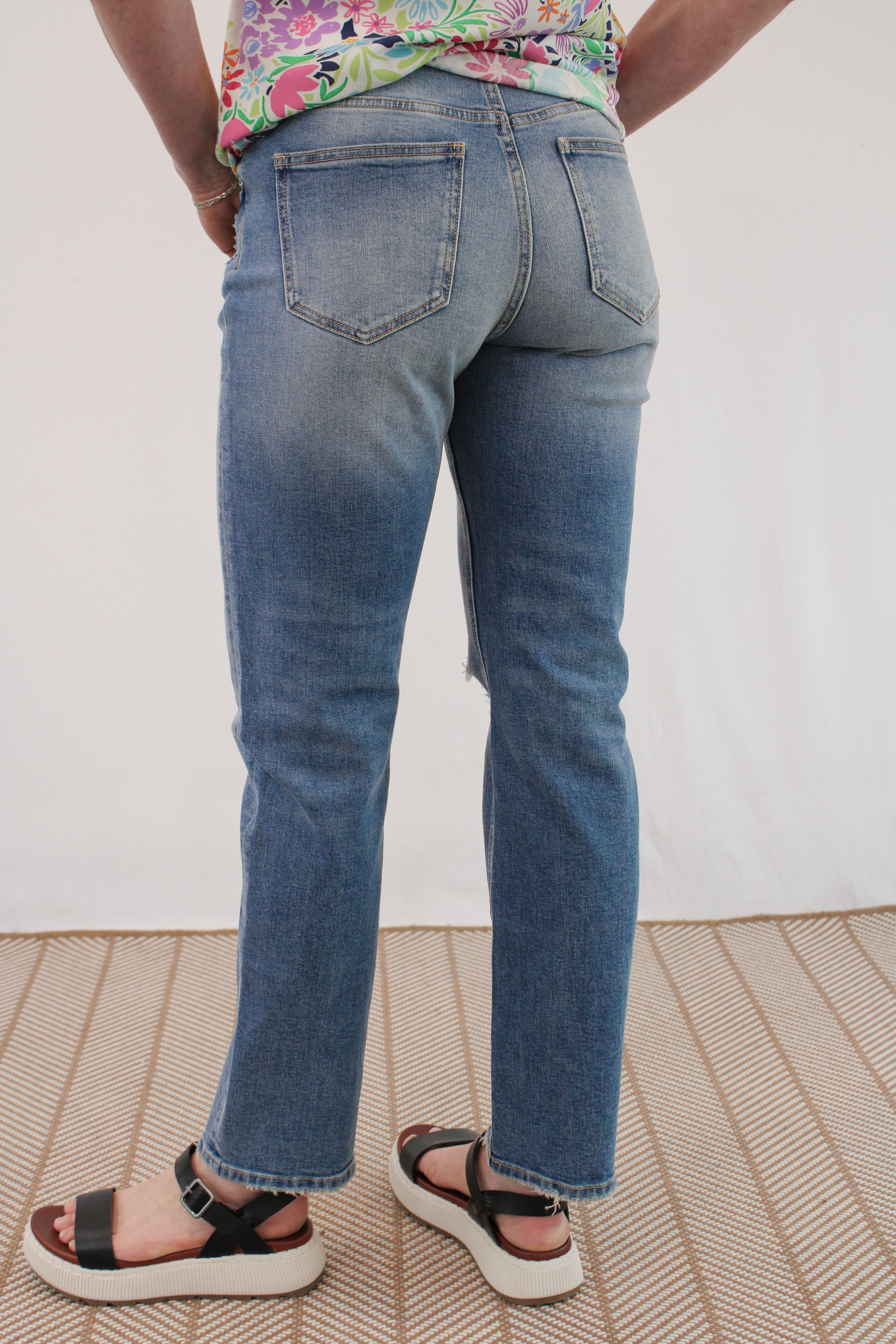 Medium mid rise slim straight distressed jeans. 10in rise