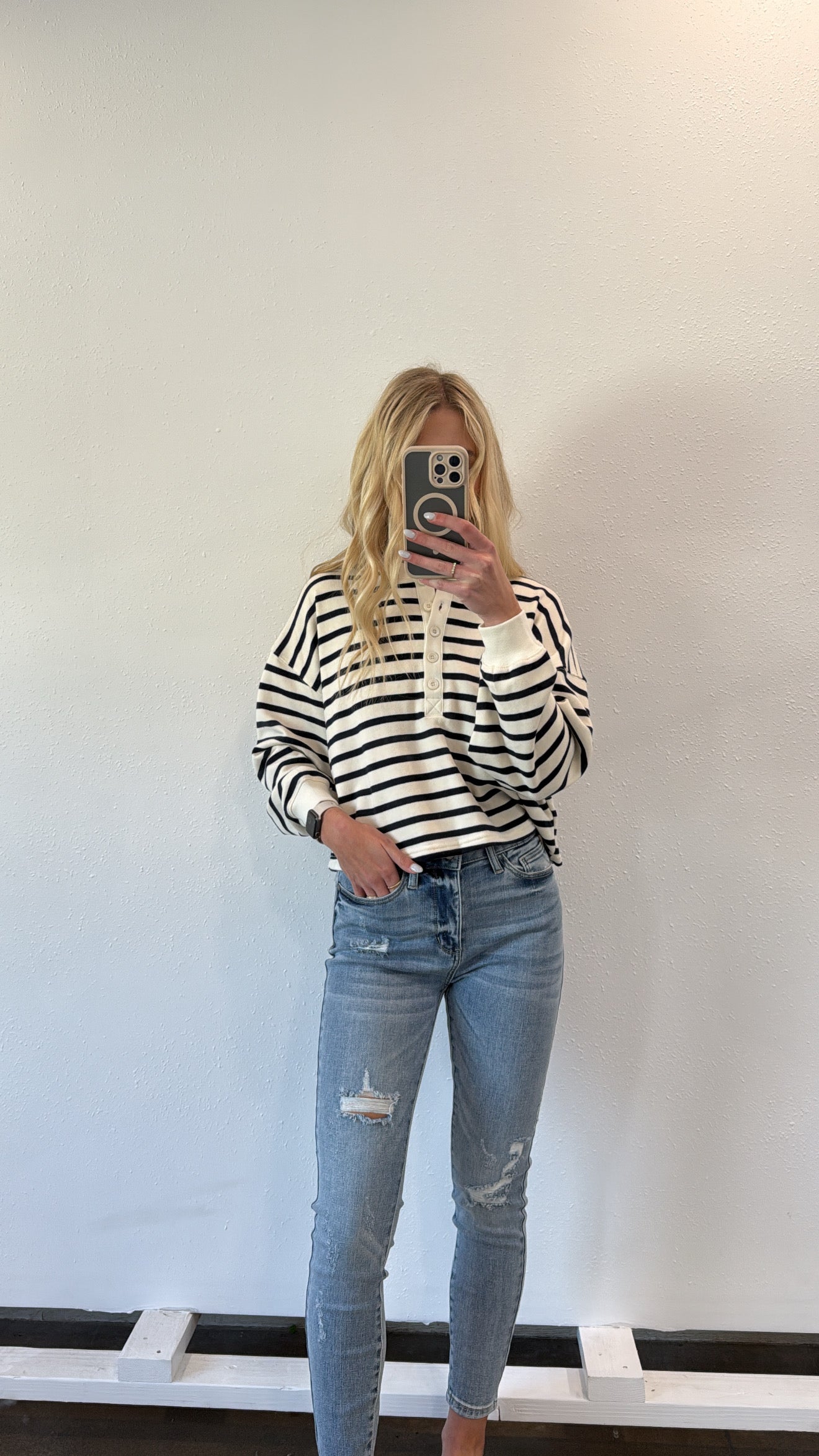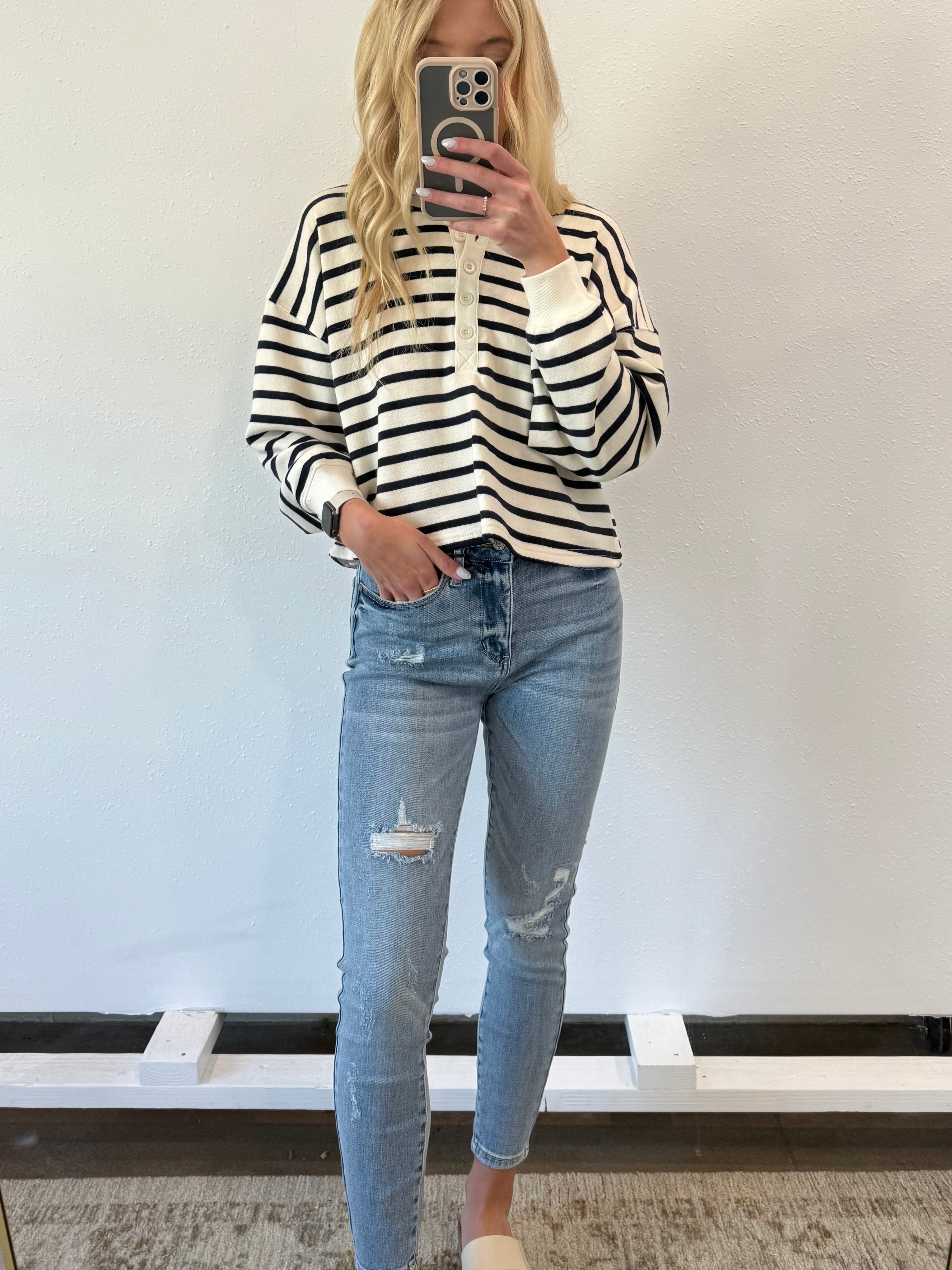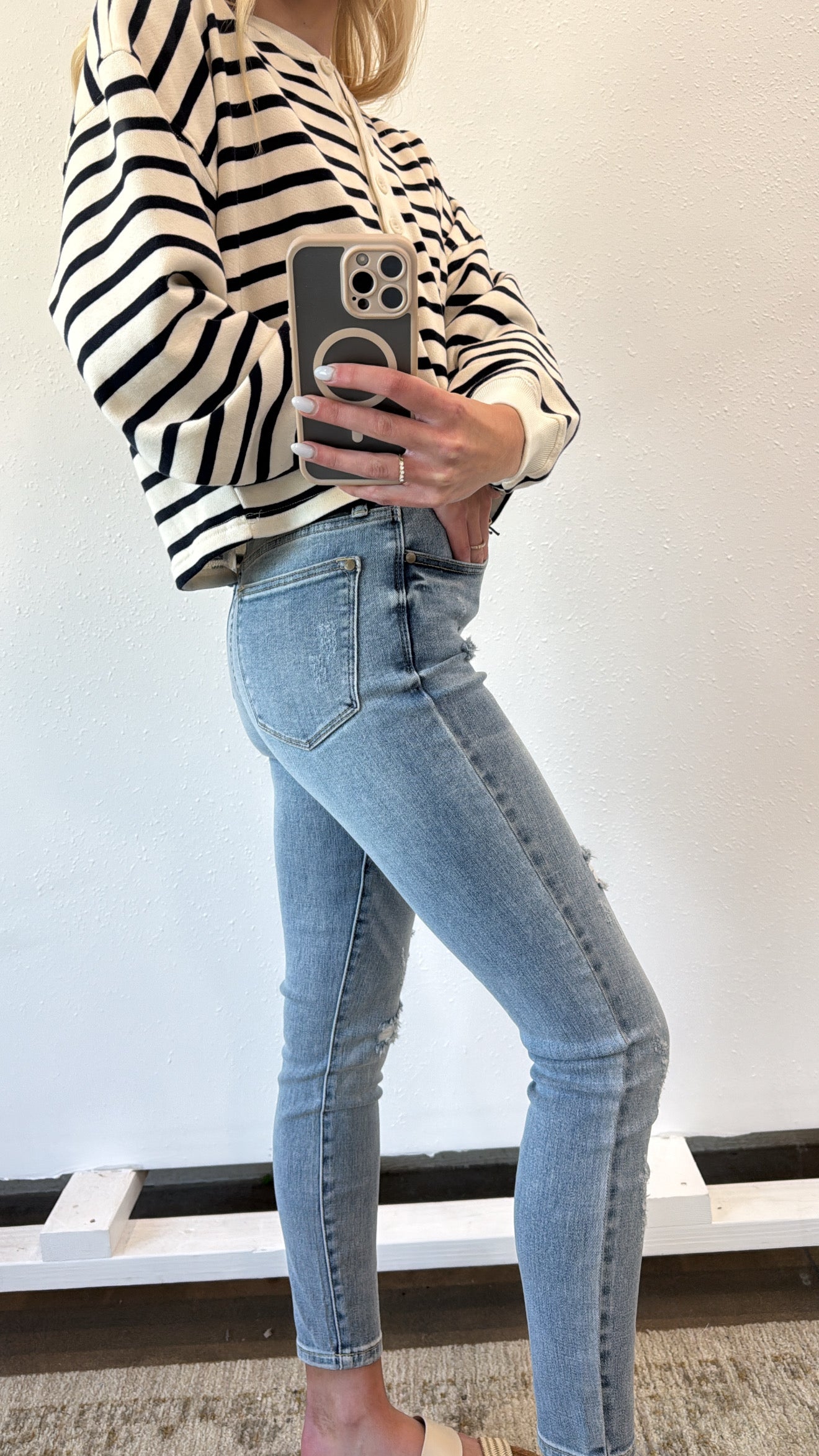 Step up your style game with the Kiley Distressed Skinny Jean! Featuring a high waist and edgy distressed details, these jeans hug your curves while adding a hint of rebellious flair. Perfect for those who love mixing comfort with a cool, playful attitude. Dress them up or down and watch your outfit come alive!