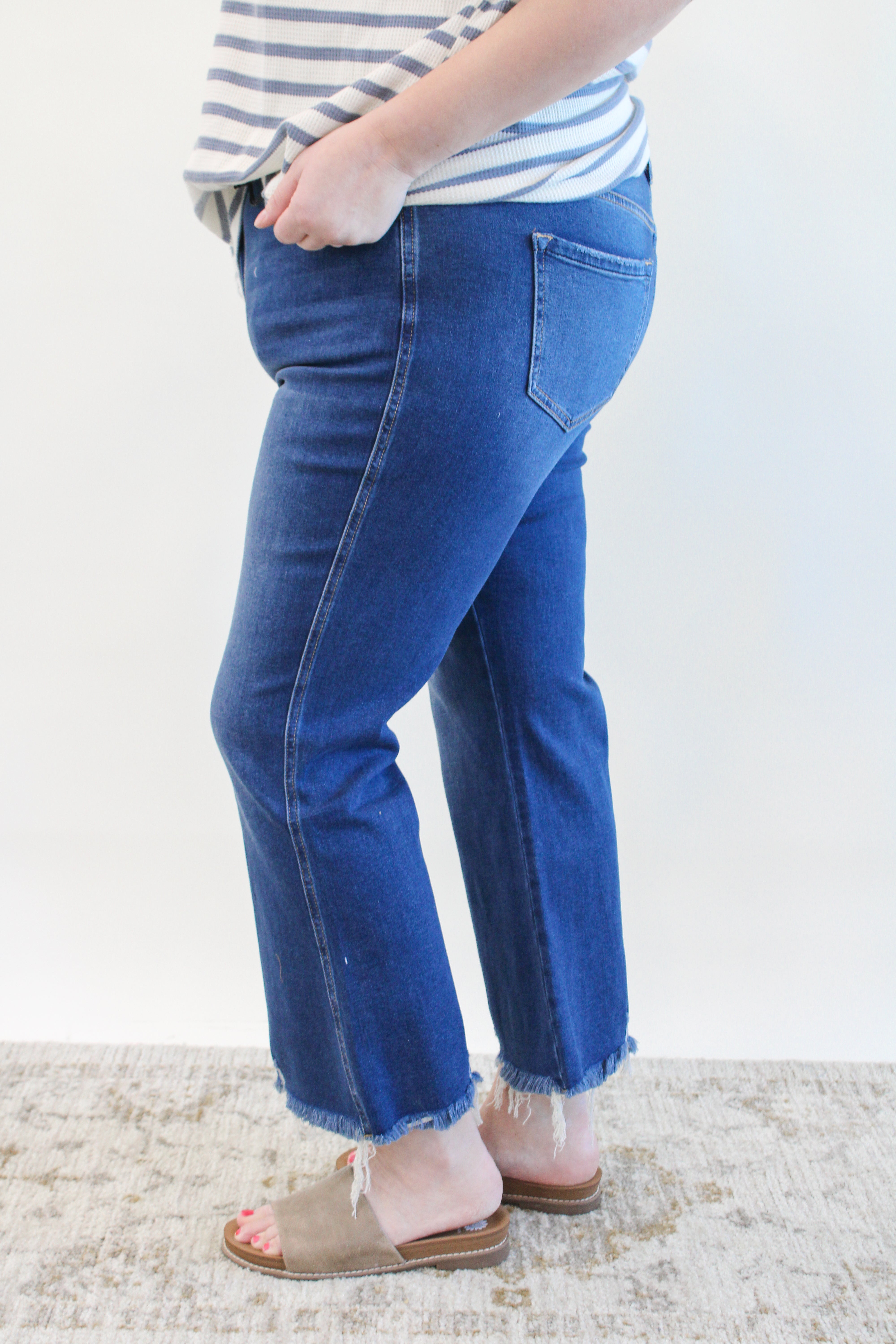 Up your denim game with our SHAYLA REG/CURVY HIGH RISE CROP FLARE jeans. Crafted with 82% cotton, 5% polyester, 12% rayon, and 1% spandex, they provide the perfect balance of comfort and stretch. The high rise and uneven hem add a touch of flair to your look. Get ready to rock these with a front rise of 10 1/4", inseam of 27", and leg opening of 18 1/2".