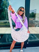 Get ready to be wowed by this fun, playful 16"x19.5" bag with a super handy zipper closure! With a 14" strap and water-resistant inner lining, this bag has got your back (and your belongings) covered. Plus, it even has an interior pocket and two exterior side pockets for extra storage. And sorry, but no returns or exchanges on this gem!