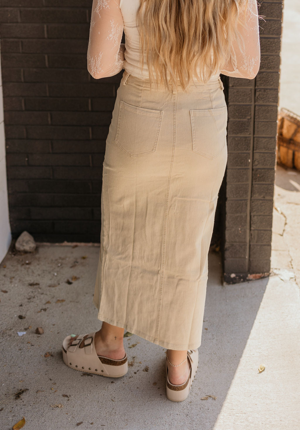 Get ready to rock the perfect blend of comfort and style with our garment washed pencil skirt. Made from stretchy twill fabric, our skirt features a metal button closure and functional front and back pockets. The open front slit adds some sass. Plus, our garment washing process makes it soft and lived in.