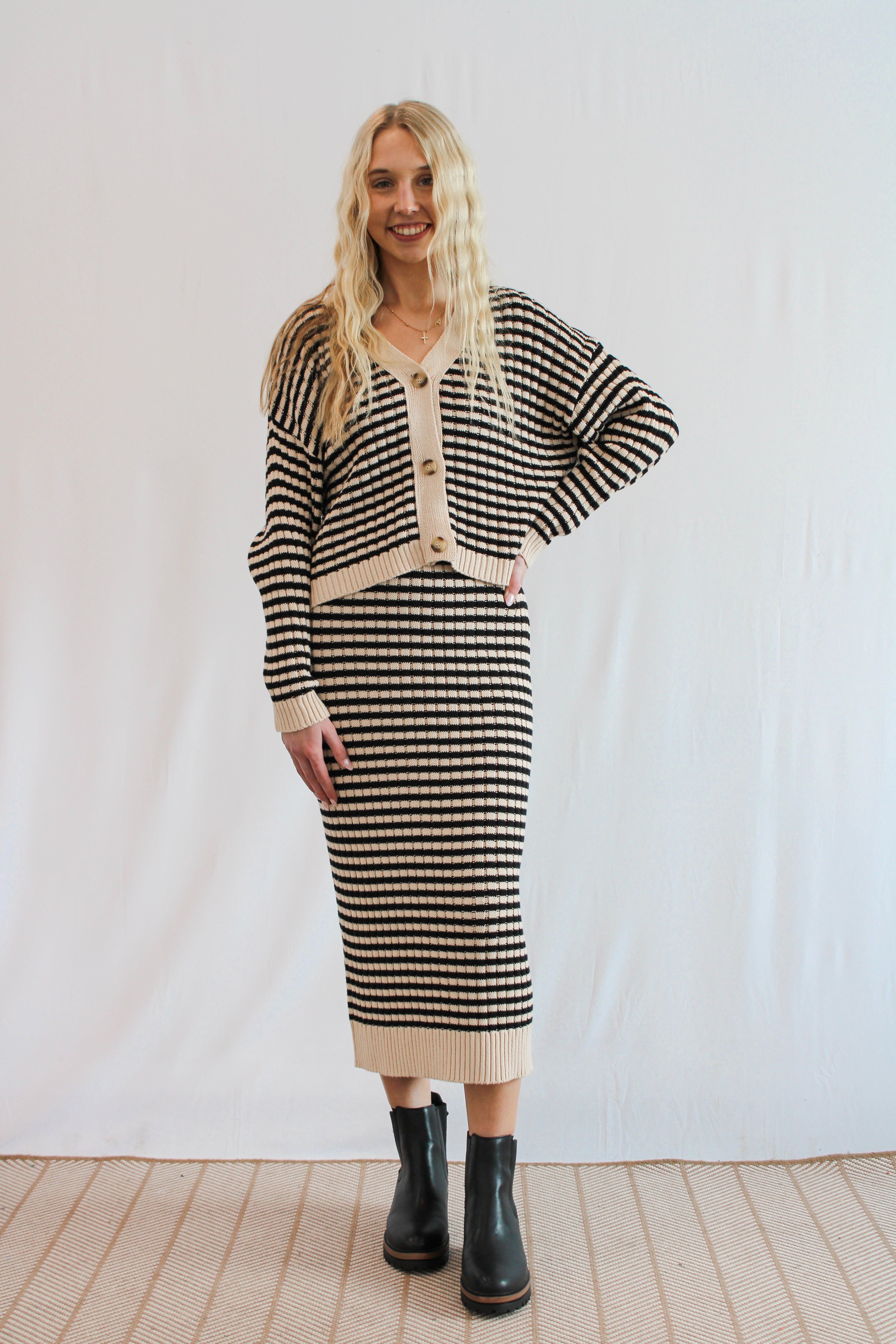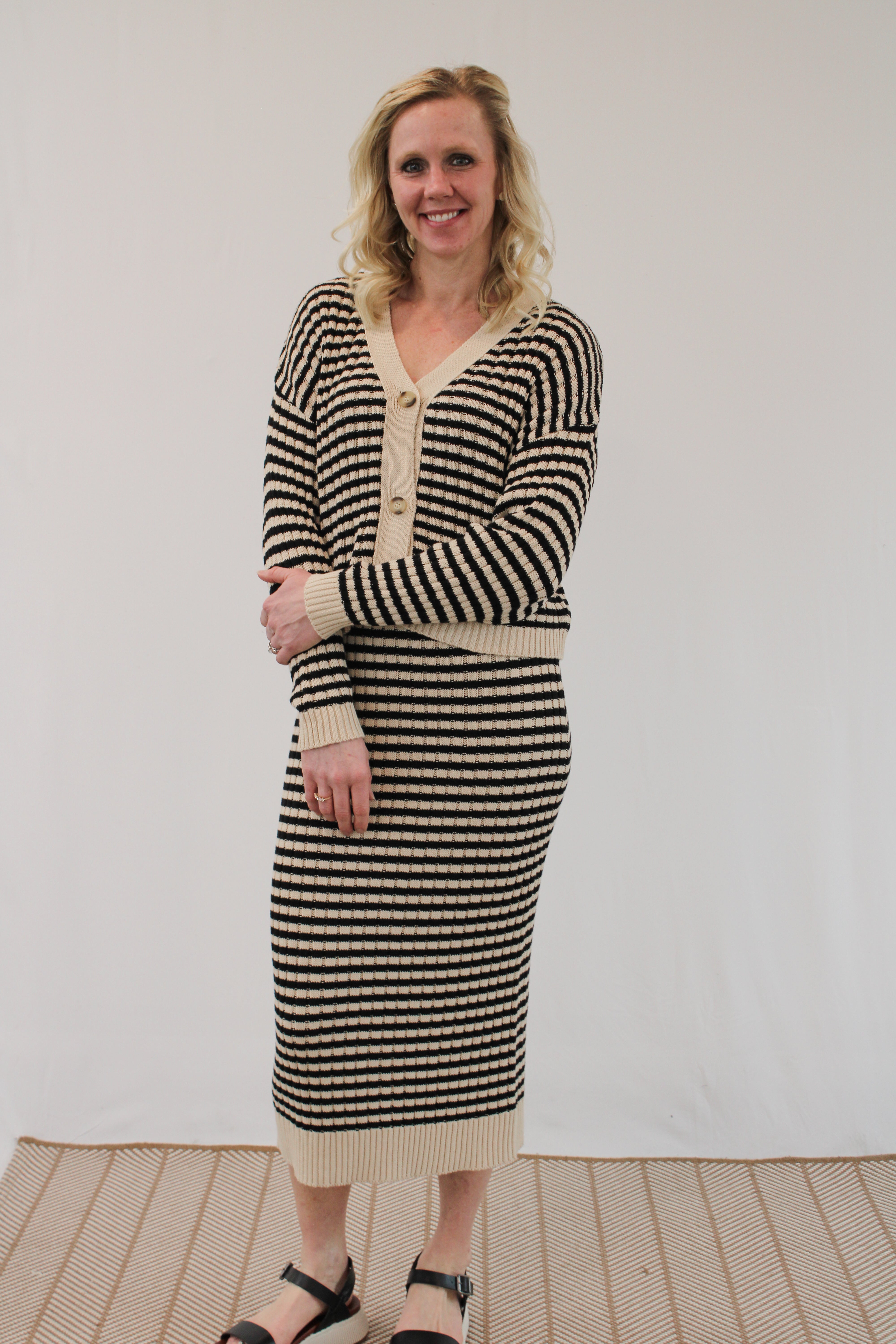 Stay cozy and stylish in the Juniper Striped Knit Cardigan by Ivy & Co. This cream and black striped cardigan features a soft and stretchy knit material, three functional buttons down the front, and ribbing at the sleeve cuffs and hem. With its slightly oversized fit, it's the perfect addition to your wardrobe.