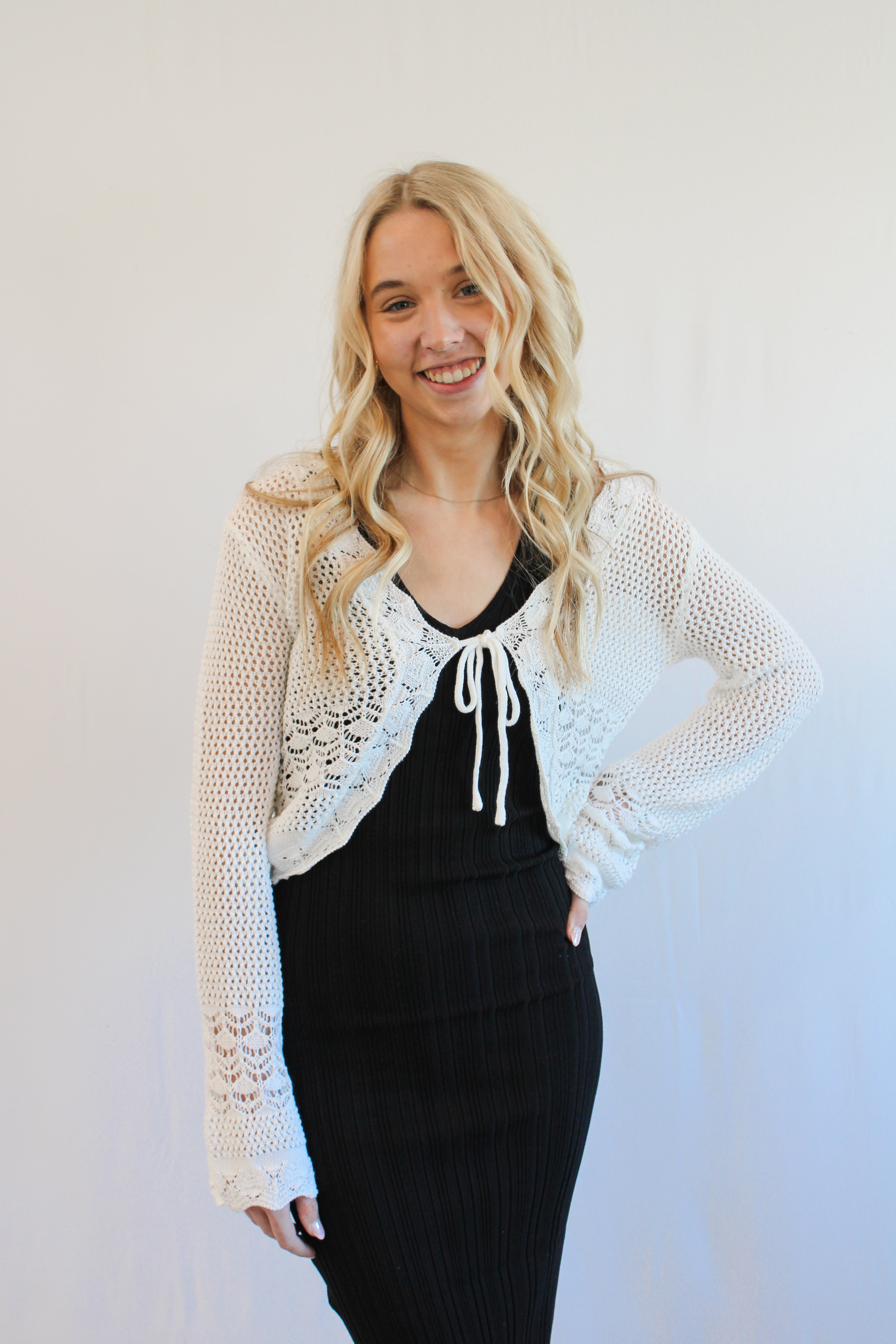 UNLEASH YOUR INNER BOHO BABE WITH THE LUNA OPEN CROCHET CARDIGAN IN OFF WHITE BY IVY & CO. PERFECT FOR LAYERING OVER YOUR FAVORITE DRESS, THIS CROP CARDIGAN ADDS A TOUCH OF PLAYFULNESS TO ANY OUTFIT!