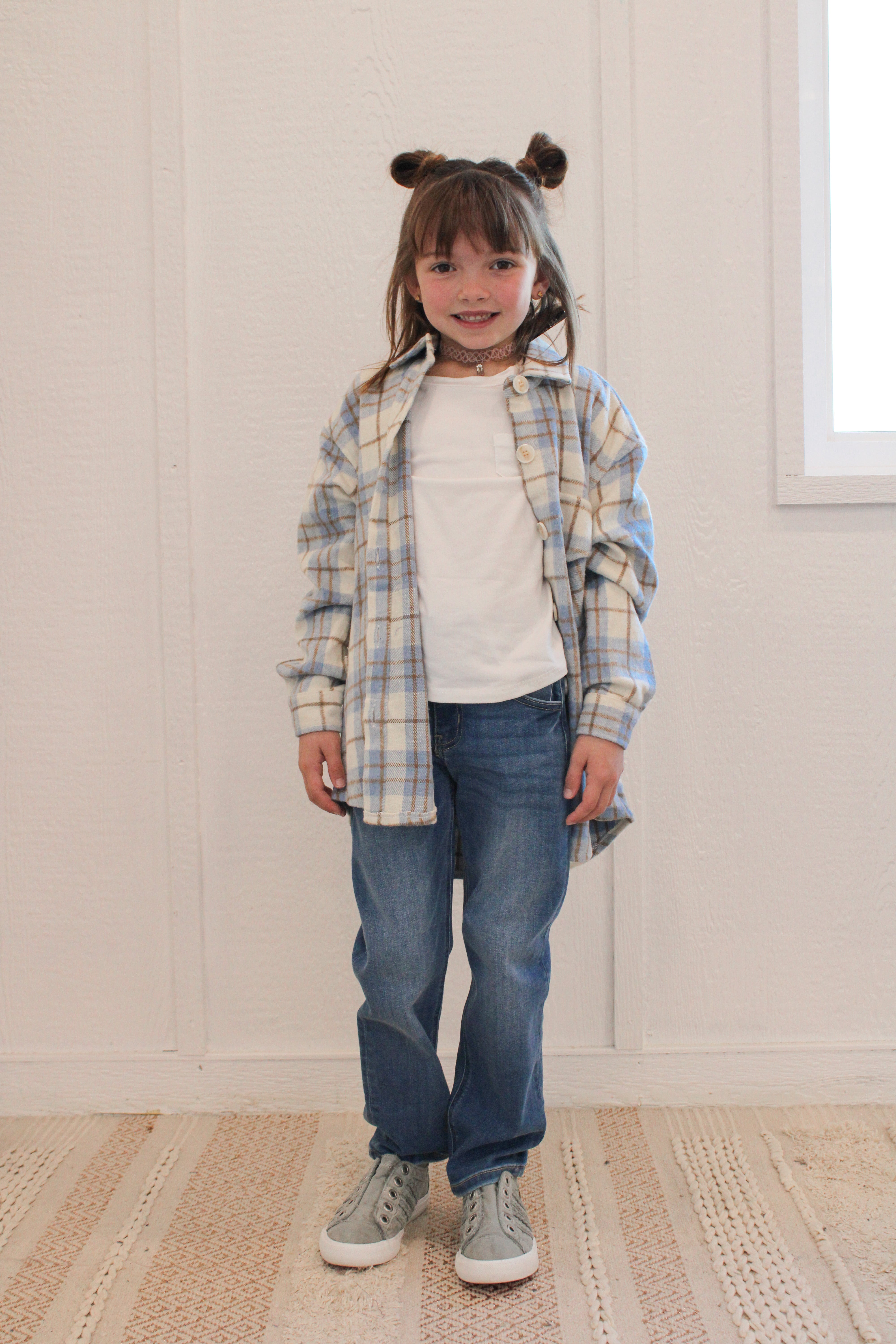 Stay warm and stylish this season with our Kaiden Girls Plaid Shacket! Made with soft flannel fabric, this classic shirt jacket features a casual loose fit, front button closure, and lapel collar. Perfect for autumn, winter, and spring, it's the ultimate addition to your little girl's wardrobe.