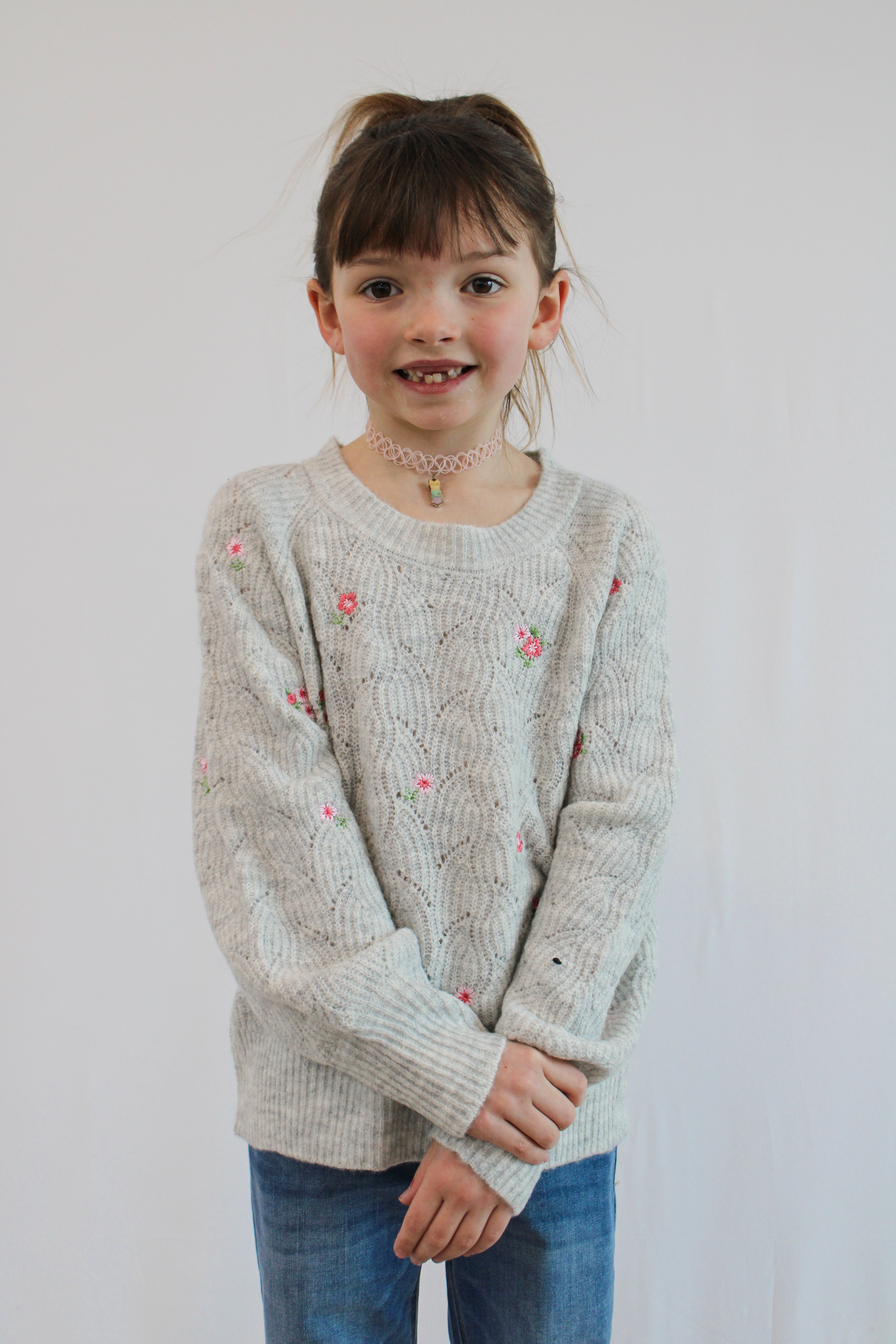 Stay cozy and stylish in our SOPHIE GIRLS RAGLAN SWEATER. With embroidered flowers and a round neck, this knit pullover is perfect for everyday wear or special occasions. Made with a 45% acrylic, 29% polyester, and 26% nylon blend, it pairs perfectly with jeans or skirts. A versatile must-have for any wardrobe!