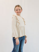 Revamp your little girl's wardrobe with the Tayla Ruffle Top! Made with woven fabric and featuring a peplum detail, this top adds a touch of flair to any outfit. The elasticized ruffle cuffs provide added comfort and style. Perfect for a playful and trendy look!