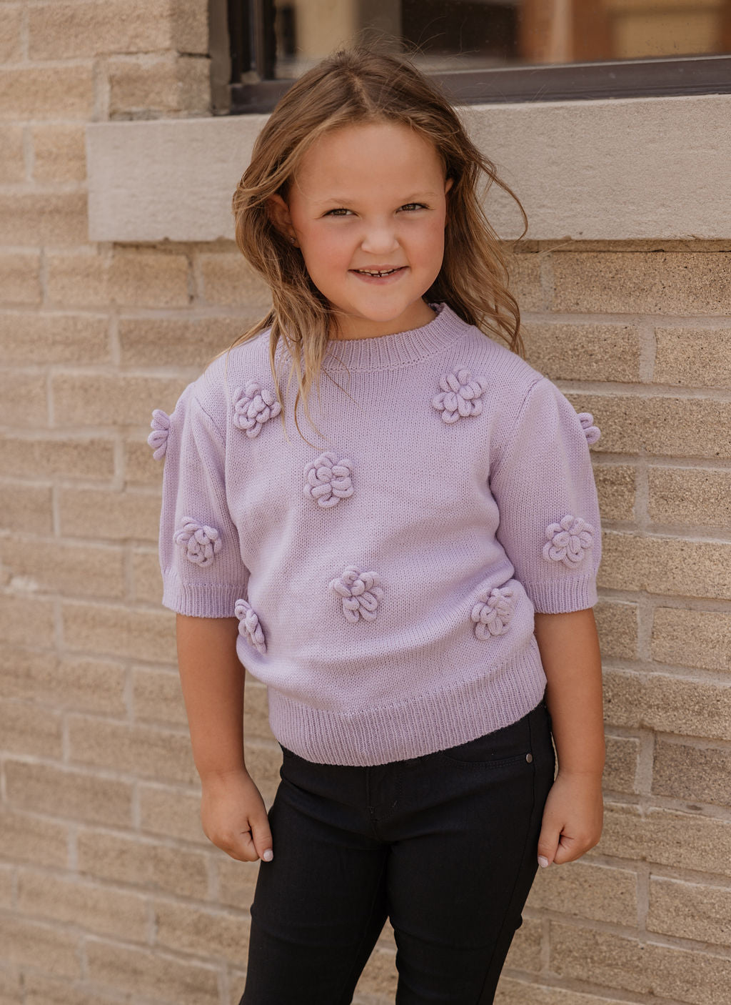 Elevate your little girl's style with our Andrea Girls Lavender Short Sleeve Sweater Top. Hand knit with a floral design, this top features a round cut neckline and puff sleeves for a charming touch. Perfect for any occasion, she'll love this unique addition to her wardrobe.