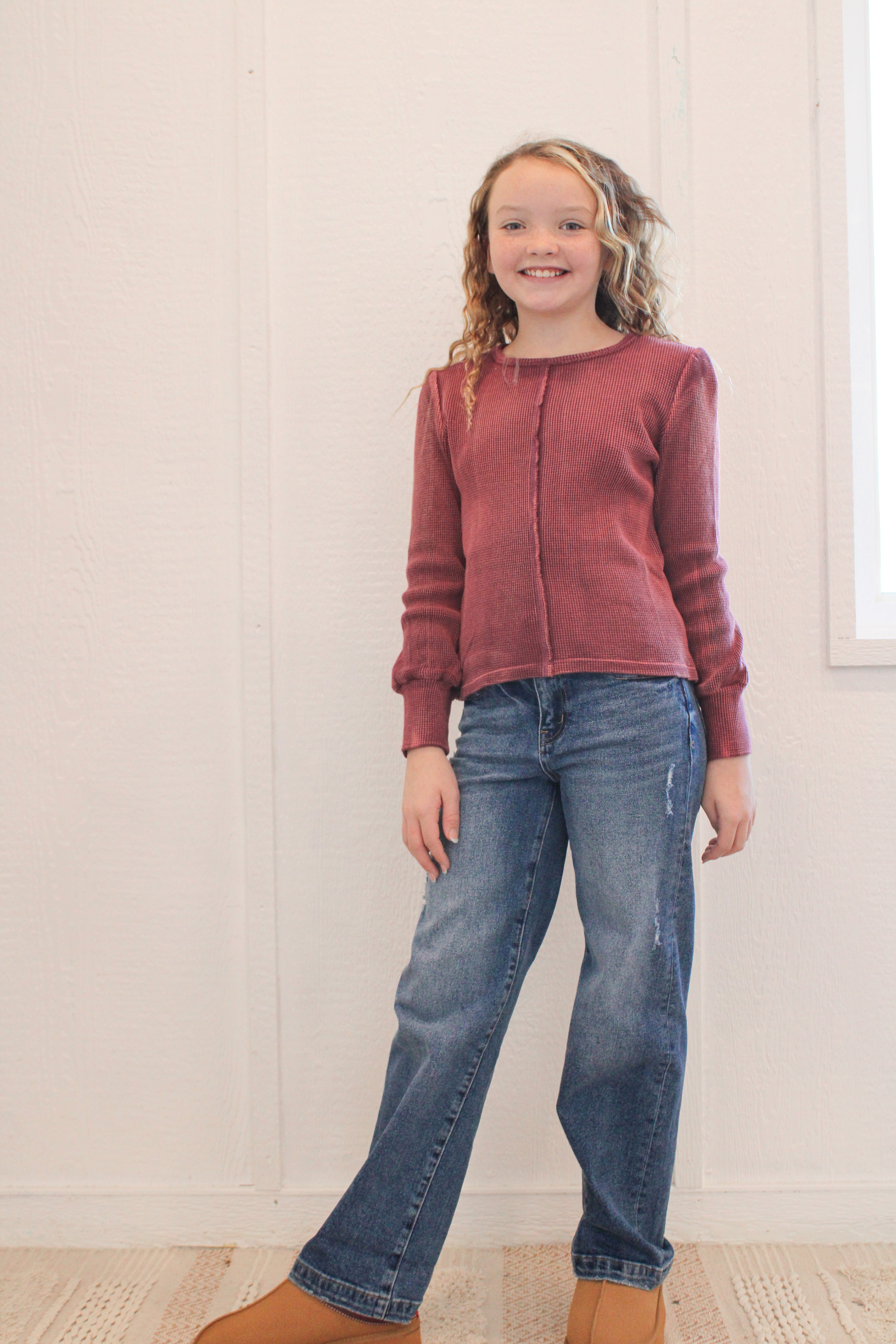 Stay cozy and stylish all season long with the FALLON GIRLS THERMAL TOP. Made with a woven fabric and featuring a round cut neckline and cuffed sleeves, this top adds a touch of detail to any outfit. Perfect for girls who want to stay warm without sacrificing style.