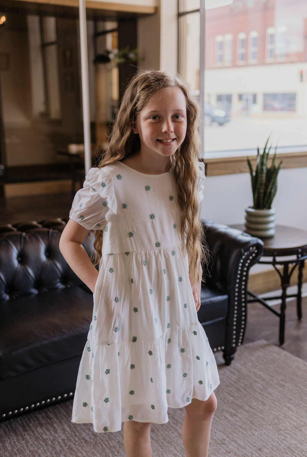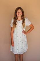 Girls cream dress with puff sleeve and sage flowers embroidered on it