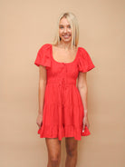 Flaunt your style in the SIENNA mini dress! This playful piece features a scoop neckline and short batwing sleeves for a breezy silhouette. The front tie strap detail adds a flirty touch, while the elasticized waist with decorative double ties creates a flattering fit. The tiered, fully lined design keeps you comfortable and confident all day long!