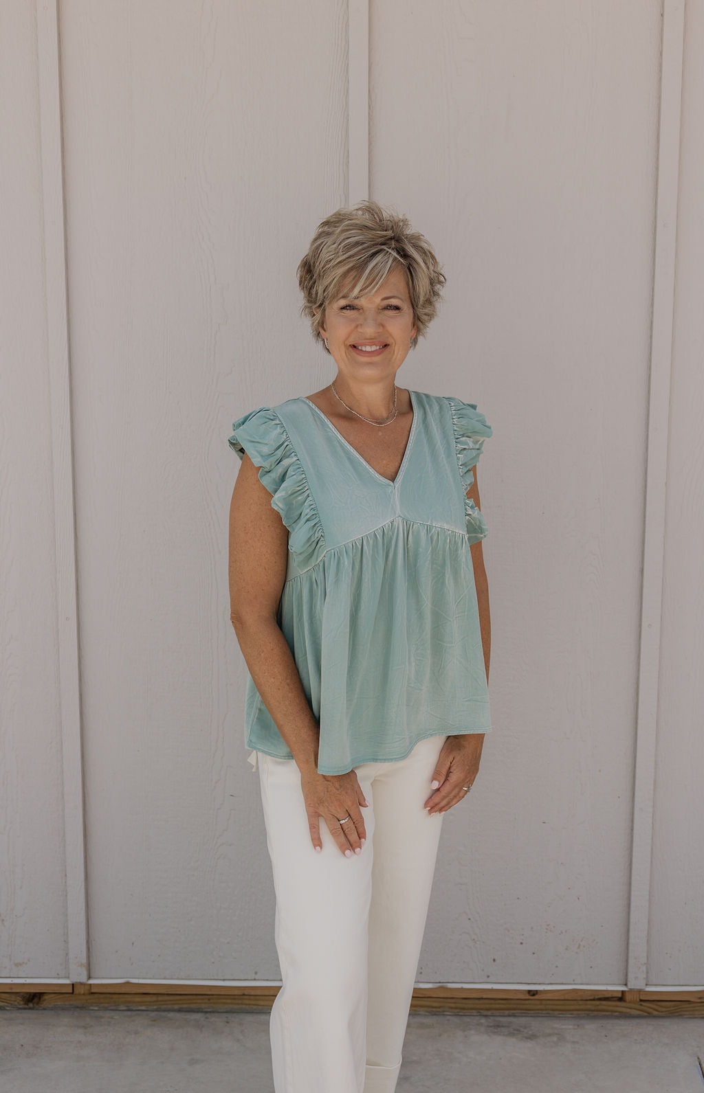Dusty teal acid washed tank top with vneck and ruffle sleeve detail