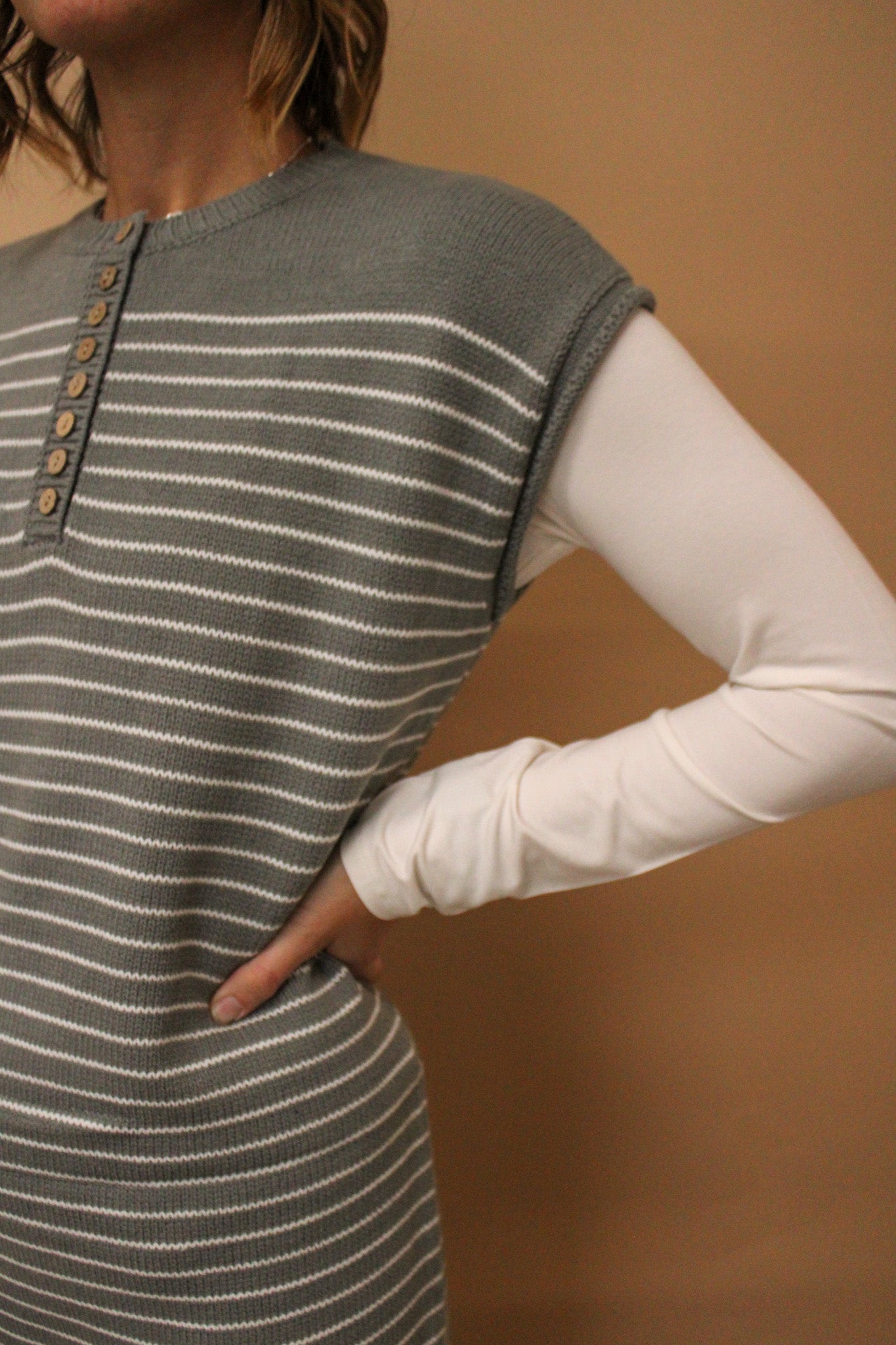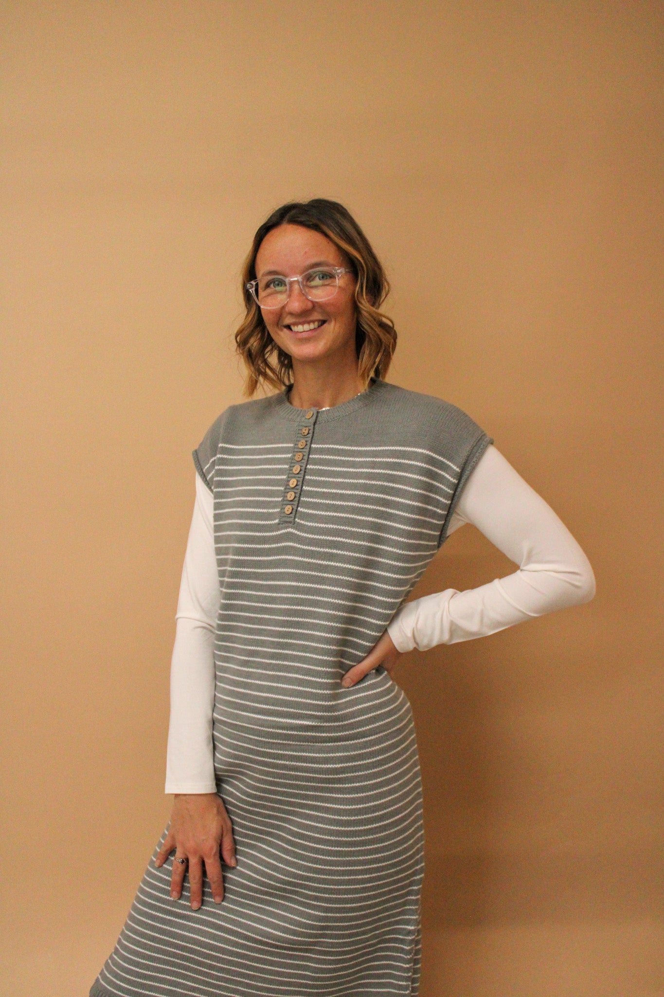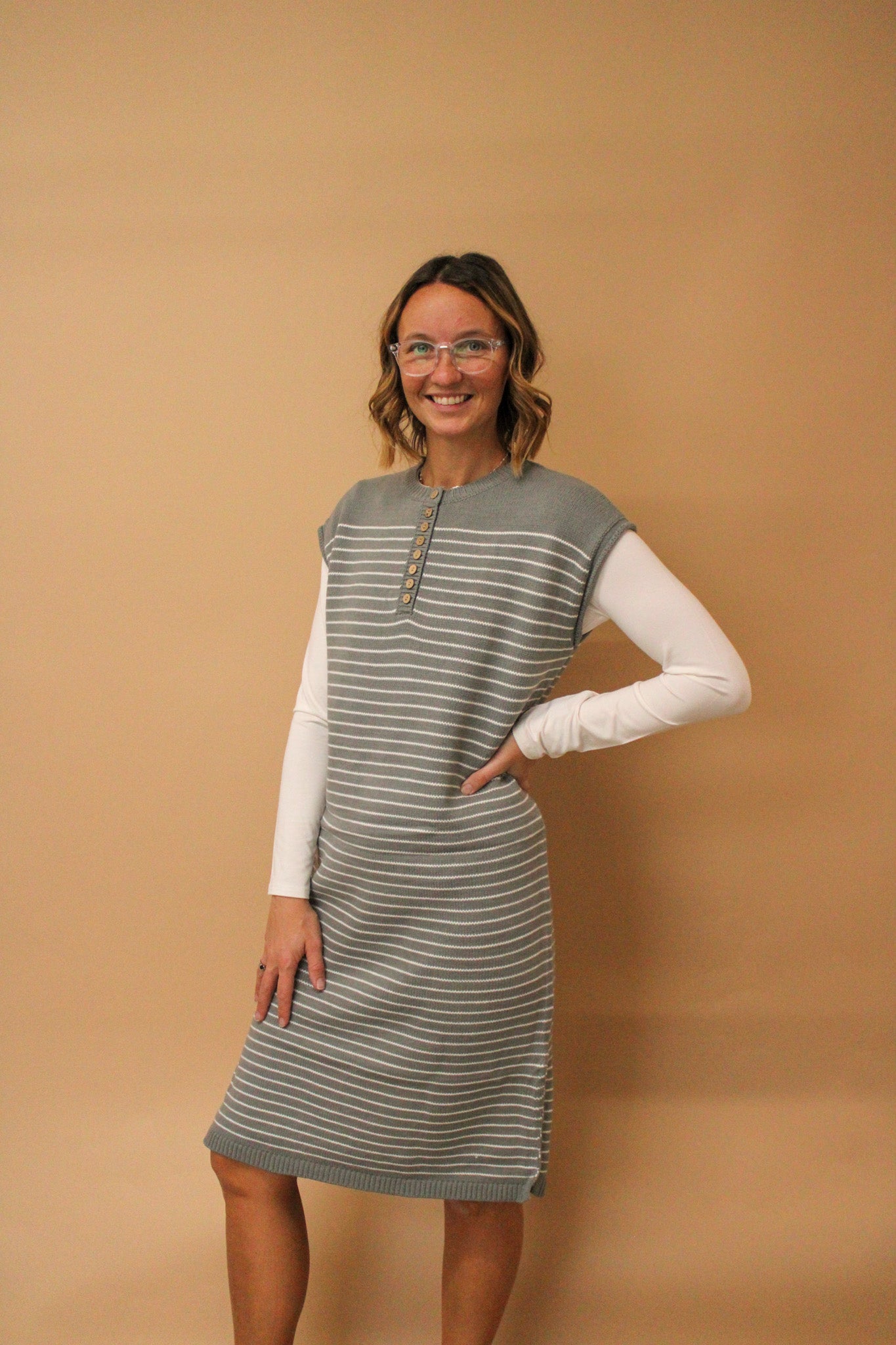 Introducing the Caprice Striped Knit Midi Sweater Dress—your new go-to for effortless style! This cozy knit features classic stripes, functional buttons for easy layering, and cheeky side slits that add movement and flair. Crafted from a comfortable acrylic and nylon blend, it's the perfect piece for transitioning from desk to dinner. At 40½" in length, it hits just right for a polished midi look. Dress it up or down—this sweater dress does it all with personality to spare!