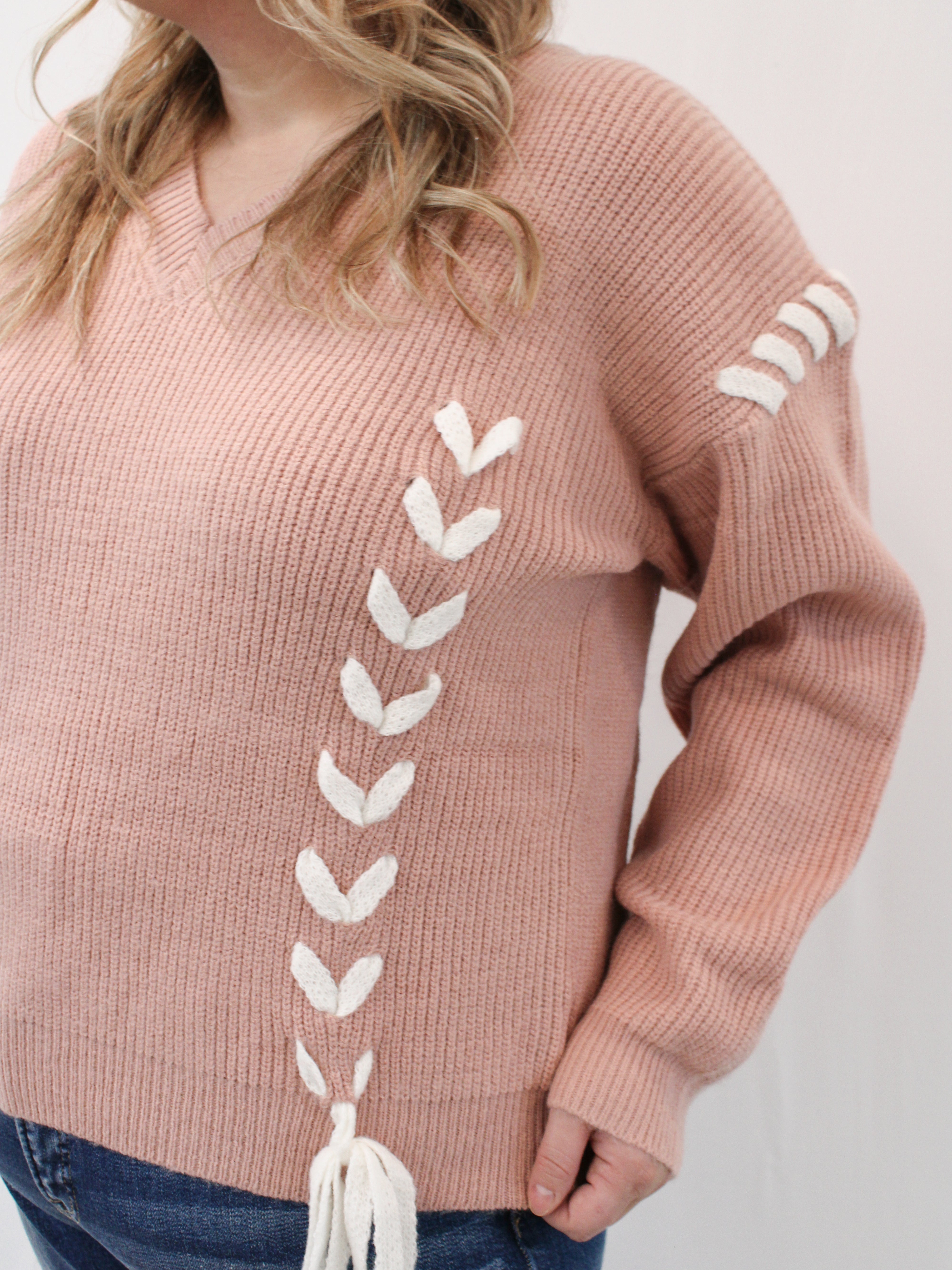Stay cozy and stylish in our "Talk about details!" sweater. Made with a soft, thick fabric and unique lacing detail, this sweater will keep you warm and looking cute.