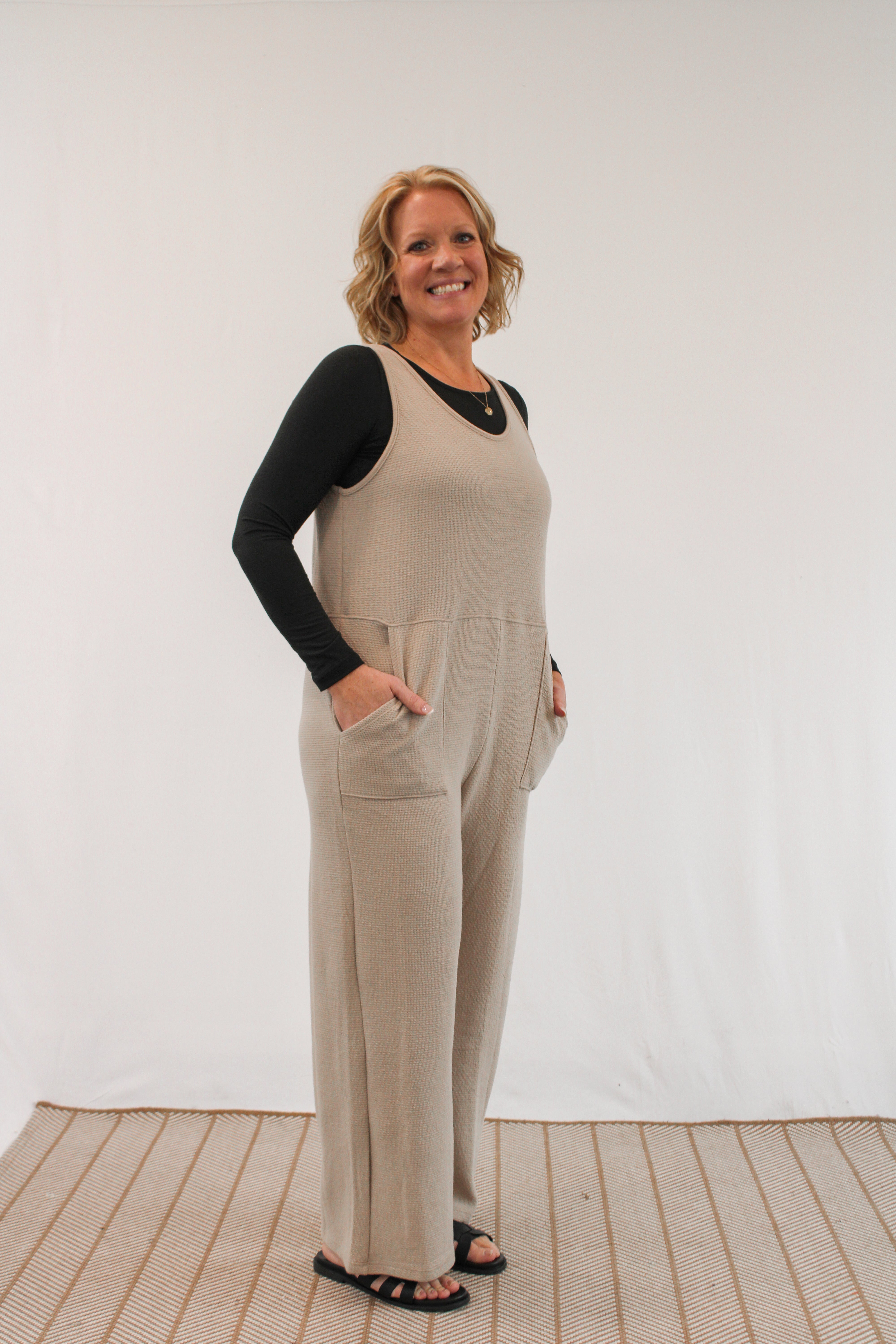 Jazz up your wardrobe with the PENLEY KNIT JUMPSUIT - the perfect blend of comfort and style. This taupe tank top jumpsuit features a convenient pocket for all your essentials. Say goodbye to boring outfits and hello to effortless fashion!
