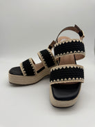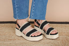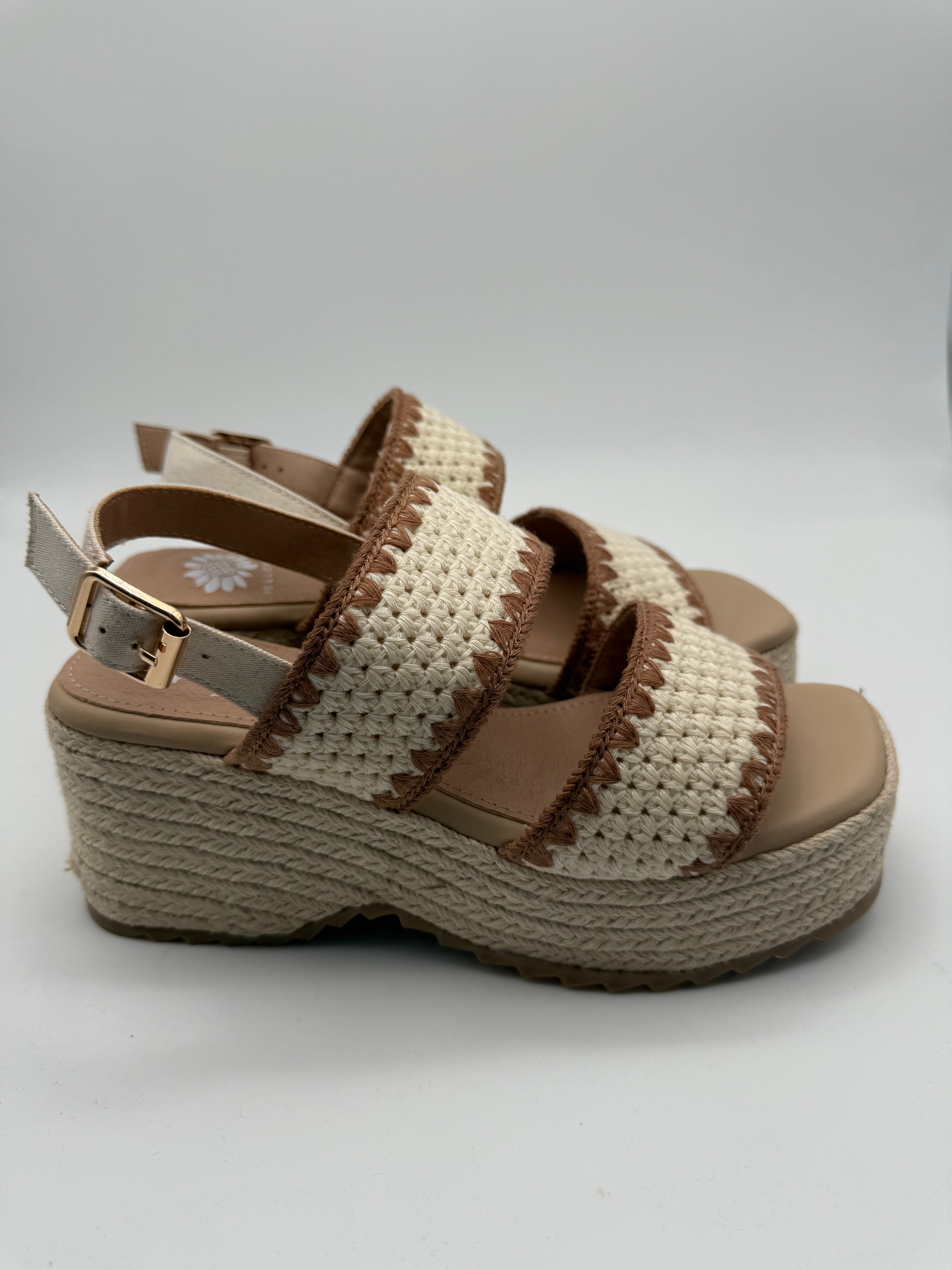 HELLEN is a 90s-inspired, two-band square-toe platform wedge. It features high-quality woven straps, a slender ankle strap with an adjustable buckle, and a Signature Yellow Box EVA foam footbed for comfort. The jute-wrapped wedge and durable rubber sole provide long-lasting support and style.