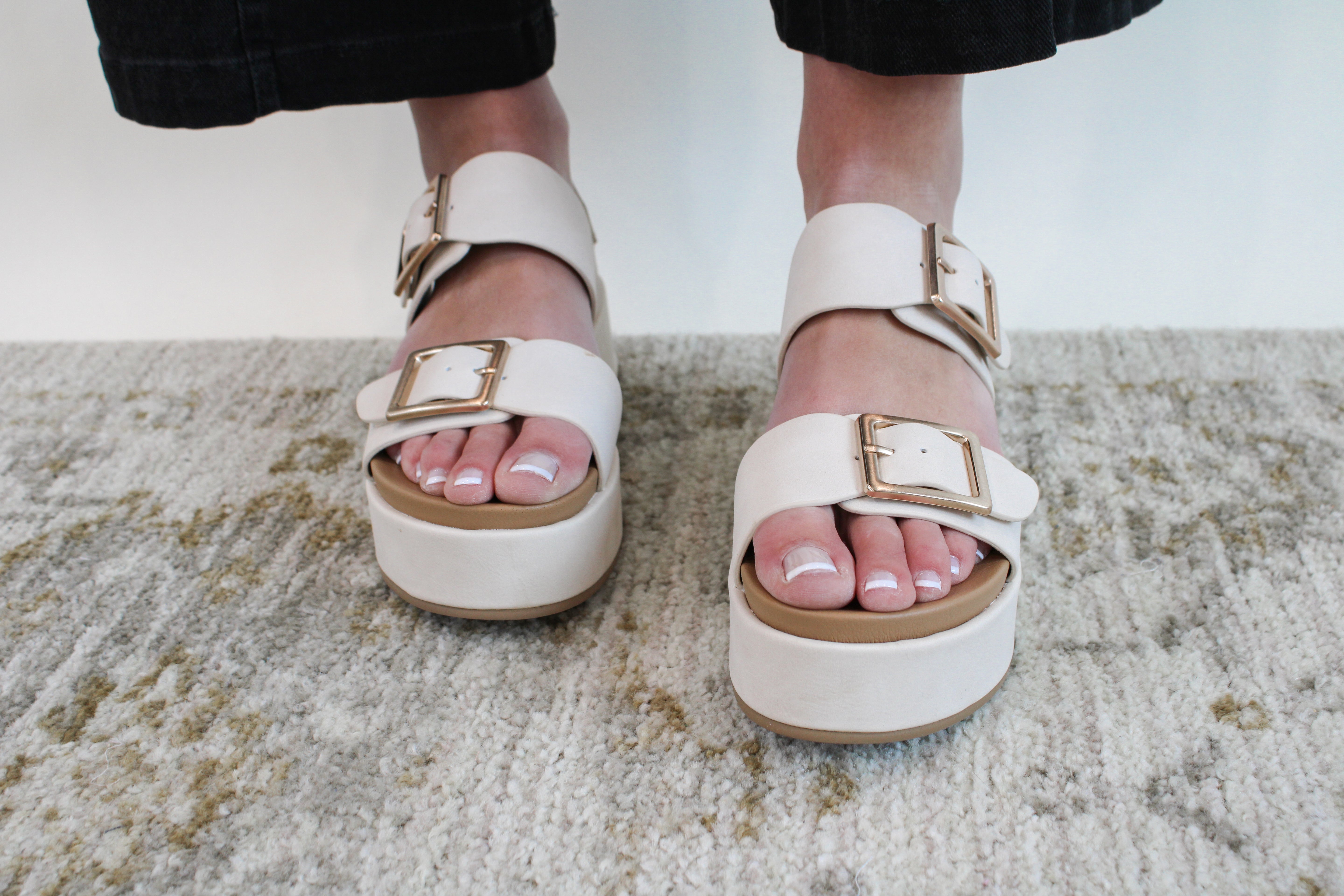 Elevate your style with the SADIE BUCKLE WEDGE SANDAL. This playful cream sandal features a trendy buckle and a comfortable wedge heel. Perfect for adding a touch of fun and flair to any outfit. (Buckle up, buttercup - this sandal will take your style to the next level!)