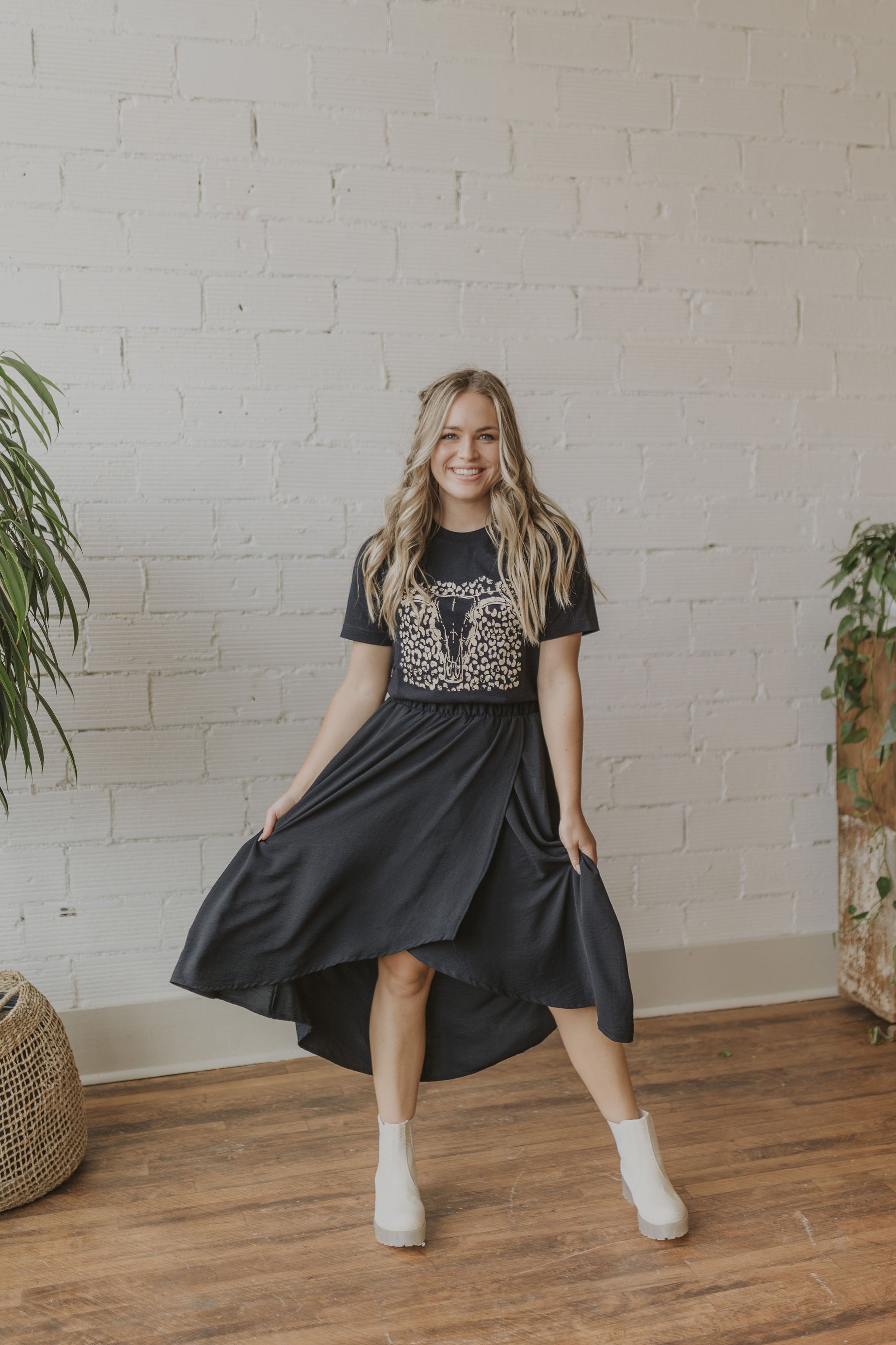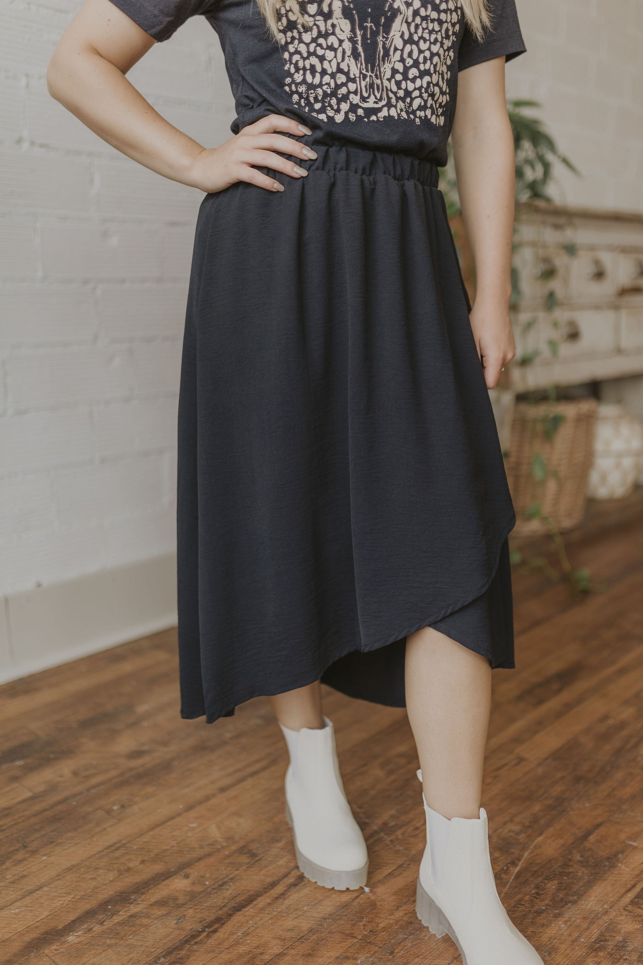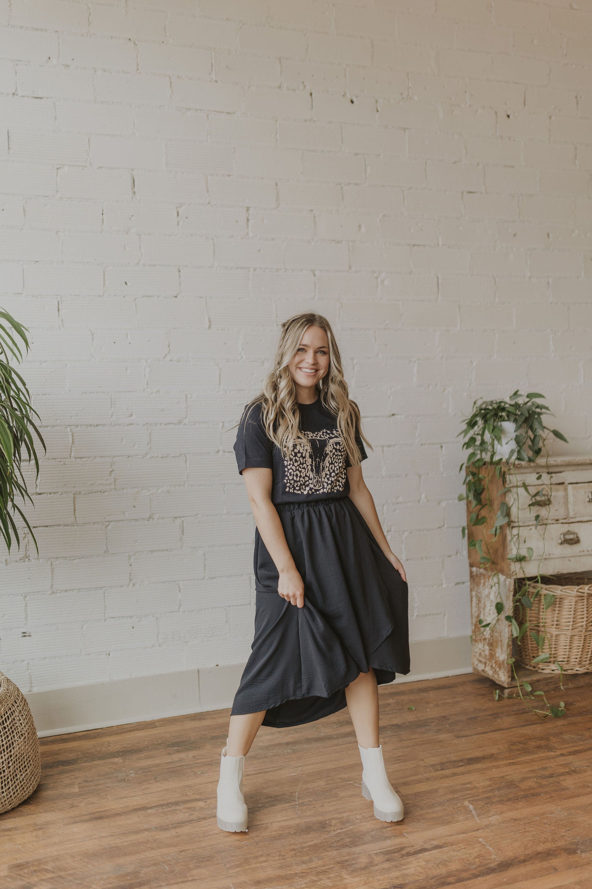 Cute skirt paired with a graphic tee or blouse for a dressier option