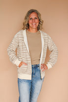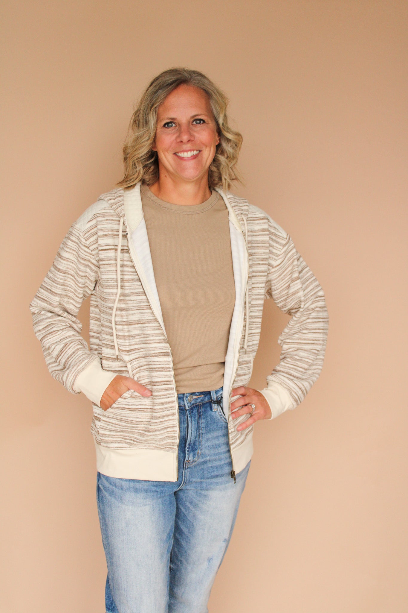 Cozy meets cool in the ALVAR Quilted Hoodie Zip-Up! This playful jacket blends soft taupe and warm brown stripes with a quilted texture, making it the perfect statement piece. Featuring a drawstring hood and handy side pockets, it’s designed for both comfort and convenience. Whether you’re lounging or out and about, this hoodie adds effortless style to your day.