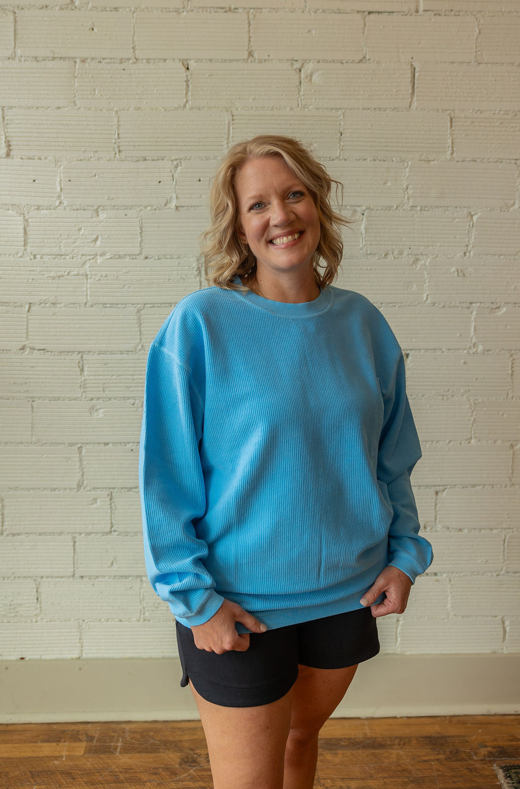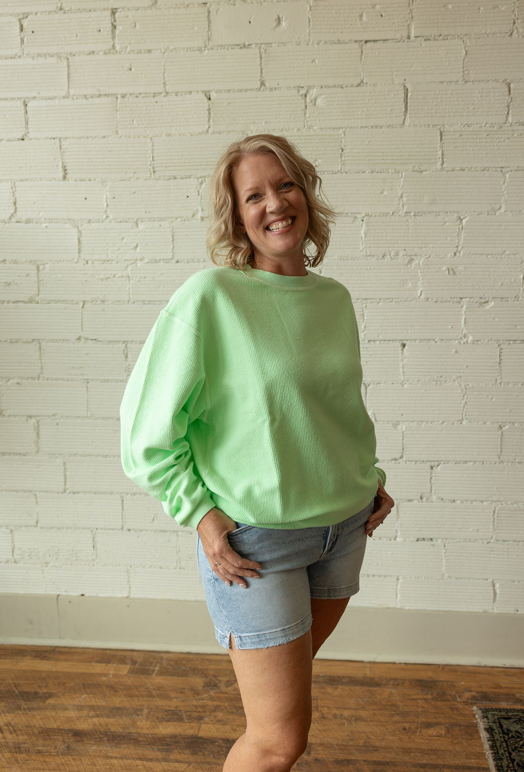 Luxury Corded Crew Sweatshirt is made of corded fabric for a soft, yet structured feel. Its vintage wash delivers rich, warm colors. Oversized fit features a ribbed crew neckline, cuffs, and hemline. Custom dyed and snow washed for softness and vintage look